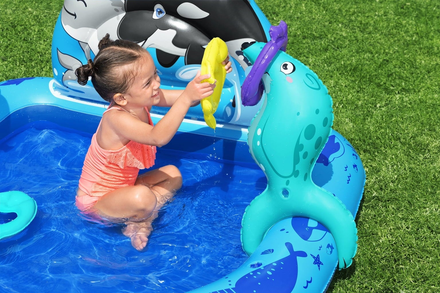 Met het Bestway Polar Pals™ waterspeelcentrum haal je Antarctica in huis! Dit speelse peuterbad biedt genoeg ruimte voor urenlang waterplezier. Het schattige Antarctische ontwerp met narwal, zeehond en pinguïn nodigt uit tot fantasierijk spel en laat kinderharten sneller kloppen. De hoorn van de narwal en de neus van de zeehond dienen als leuk ringwerpspel waarbij je kleintjes hun vaardigheden kunnen laten zien. Twee schuimrubberen vissen zorgen voor extra speelplezier; ze kunnen niet alleen door het water glijden, maar ook in de bek van de pinguïn worden gestopt.