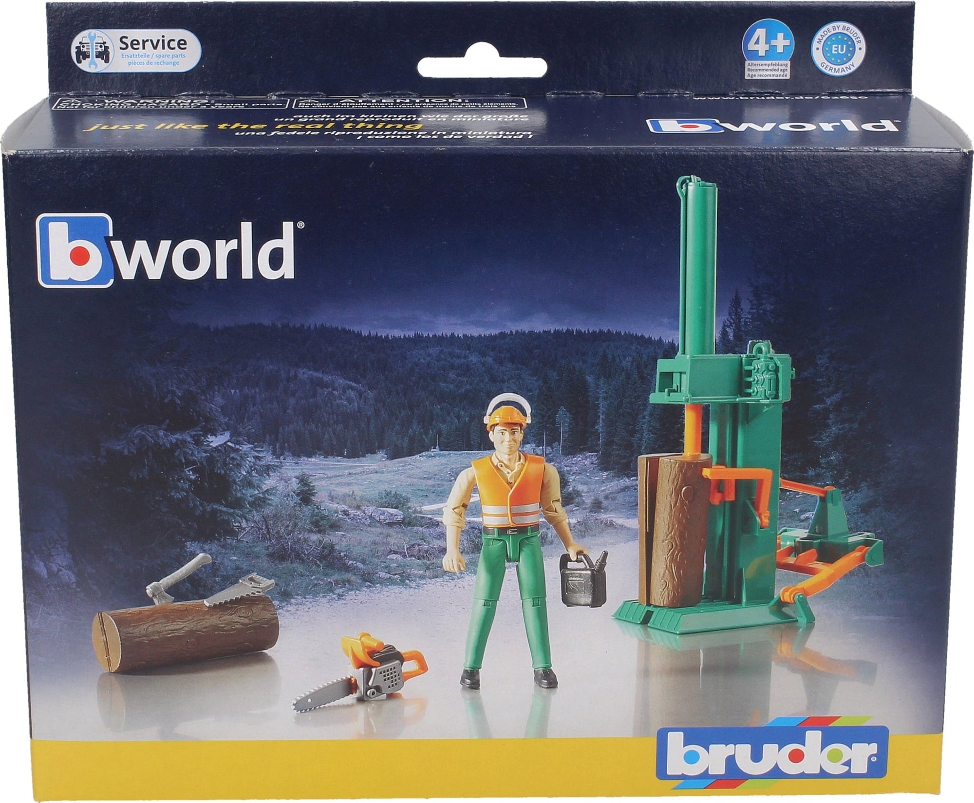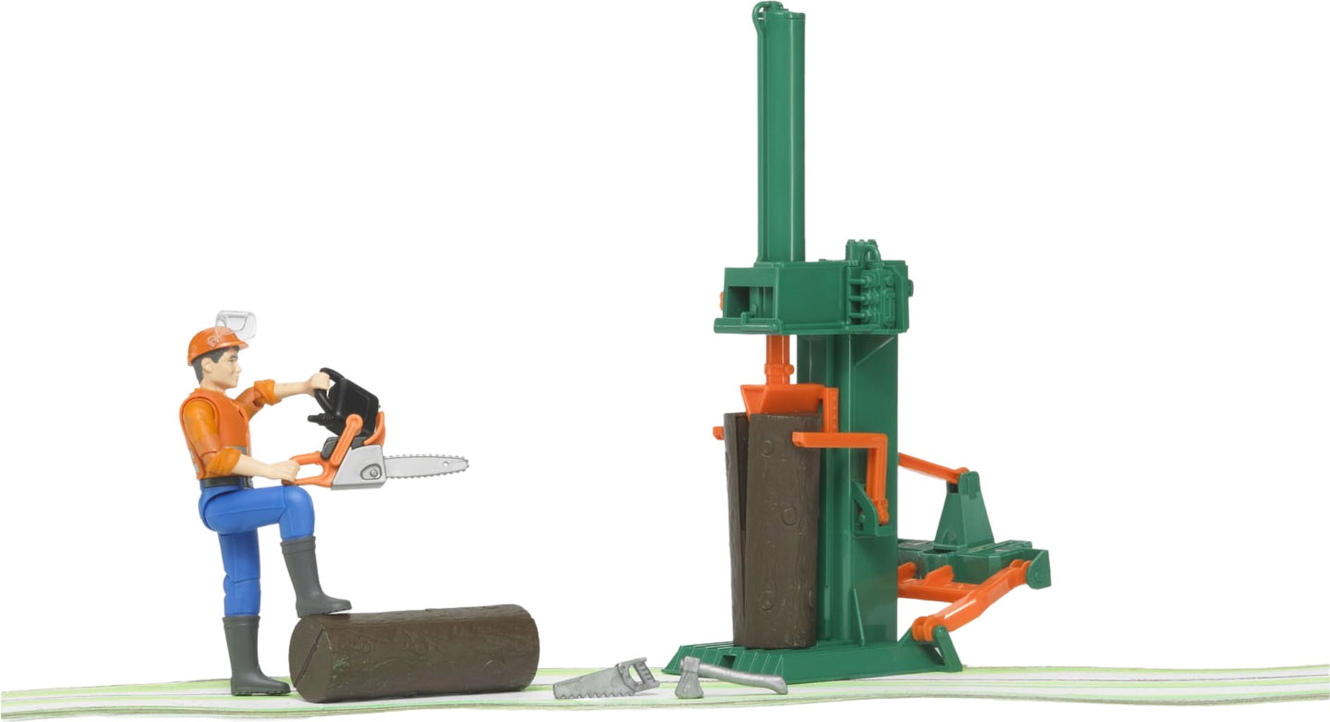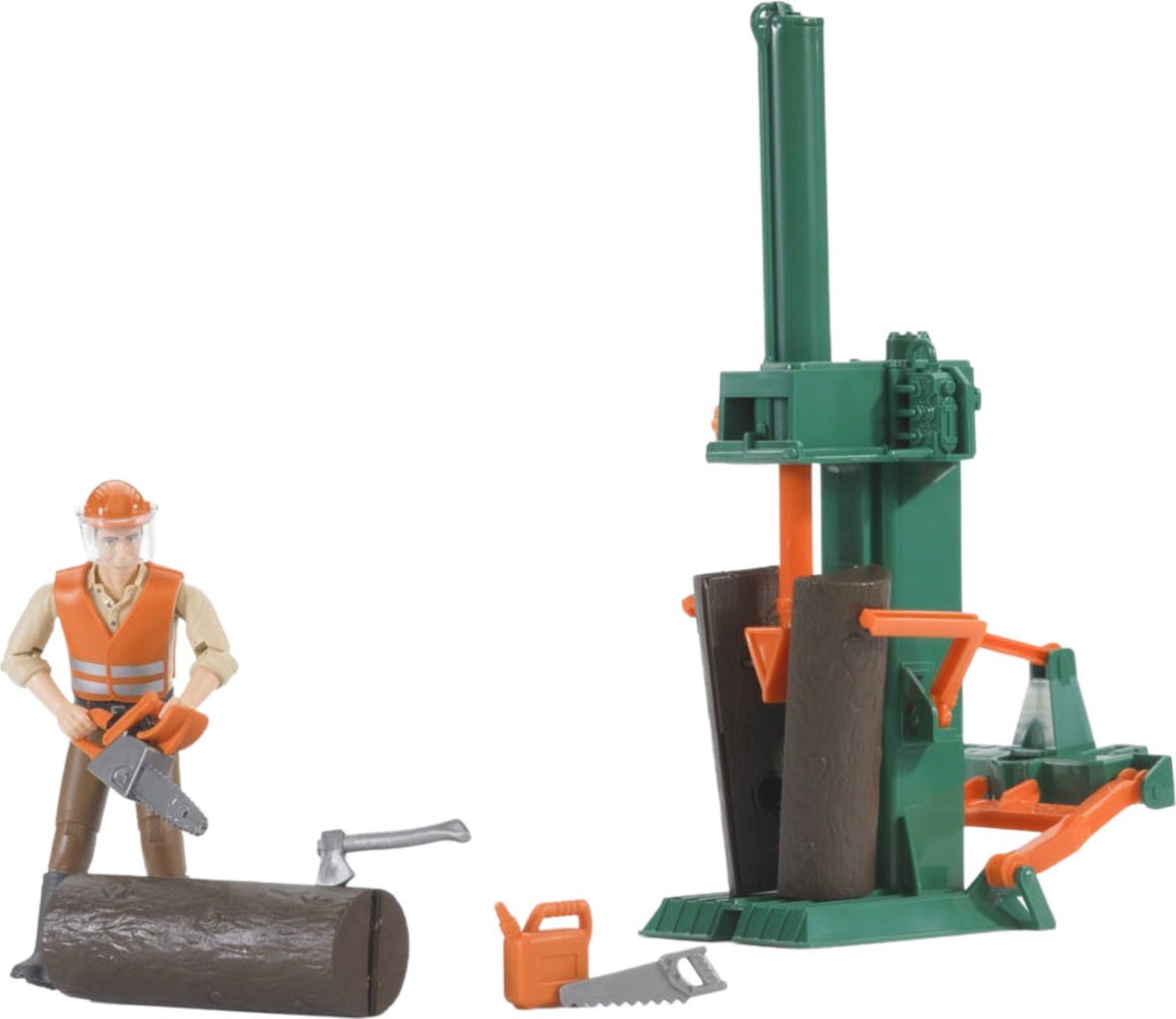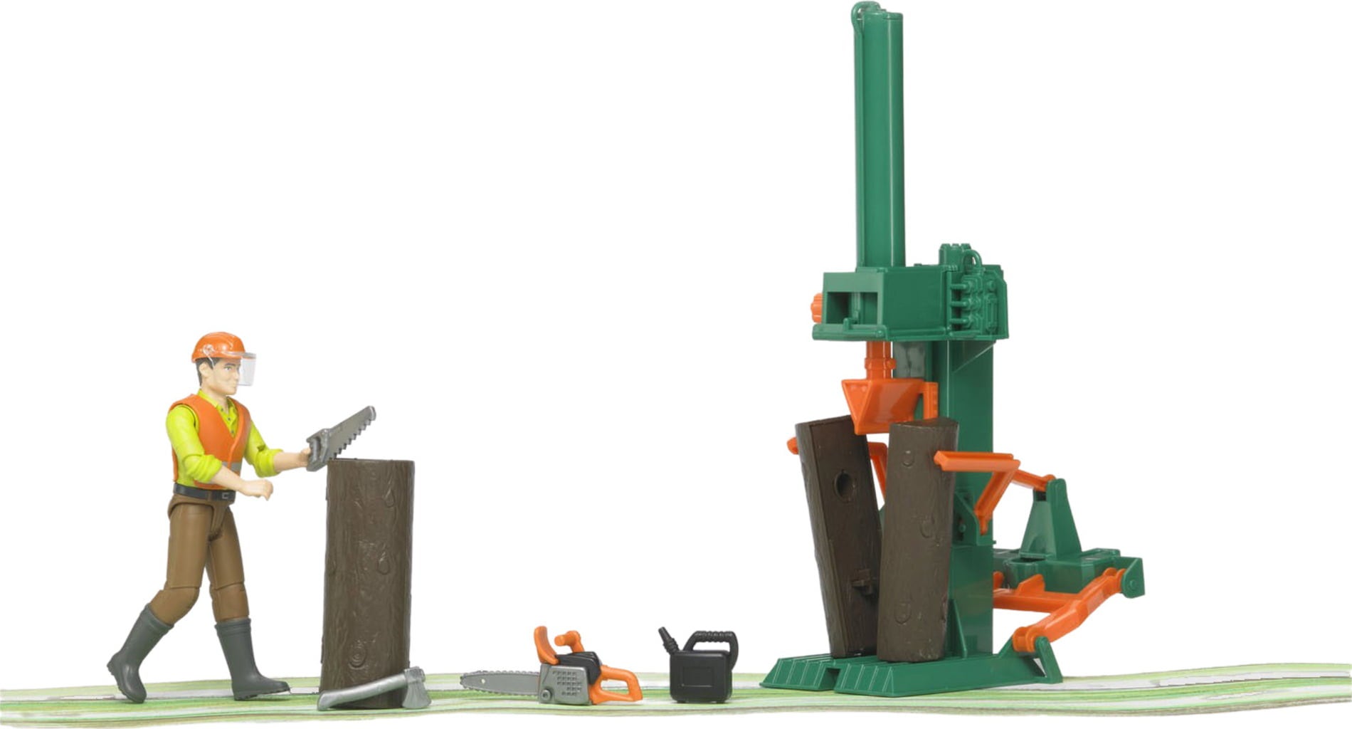 Om ervoor te zorgen dat alle huizen in de winter voldoende brandhout hebben, werken de bosarbeiders onvermoeibaar in de bossen. Ze kappen grote bomen, zagen ze in stukken en hakken de stammen in compacte blokken. De werker is uitgerust met realistisch vormgegeven gereedschappen zodat kinderen met deze set alle werkstappen spelenderwijs kunnen doorlopen: van een kettingzaag tot een kloofmachine en een bijl, deze set laat niets te wensen over. Omdat veiligheid zeer belangrijk is in de bosbouw, is de hardwerkende werker uitgerust met een helm en een beschermend vest.