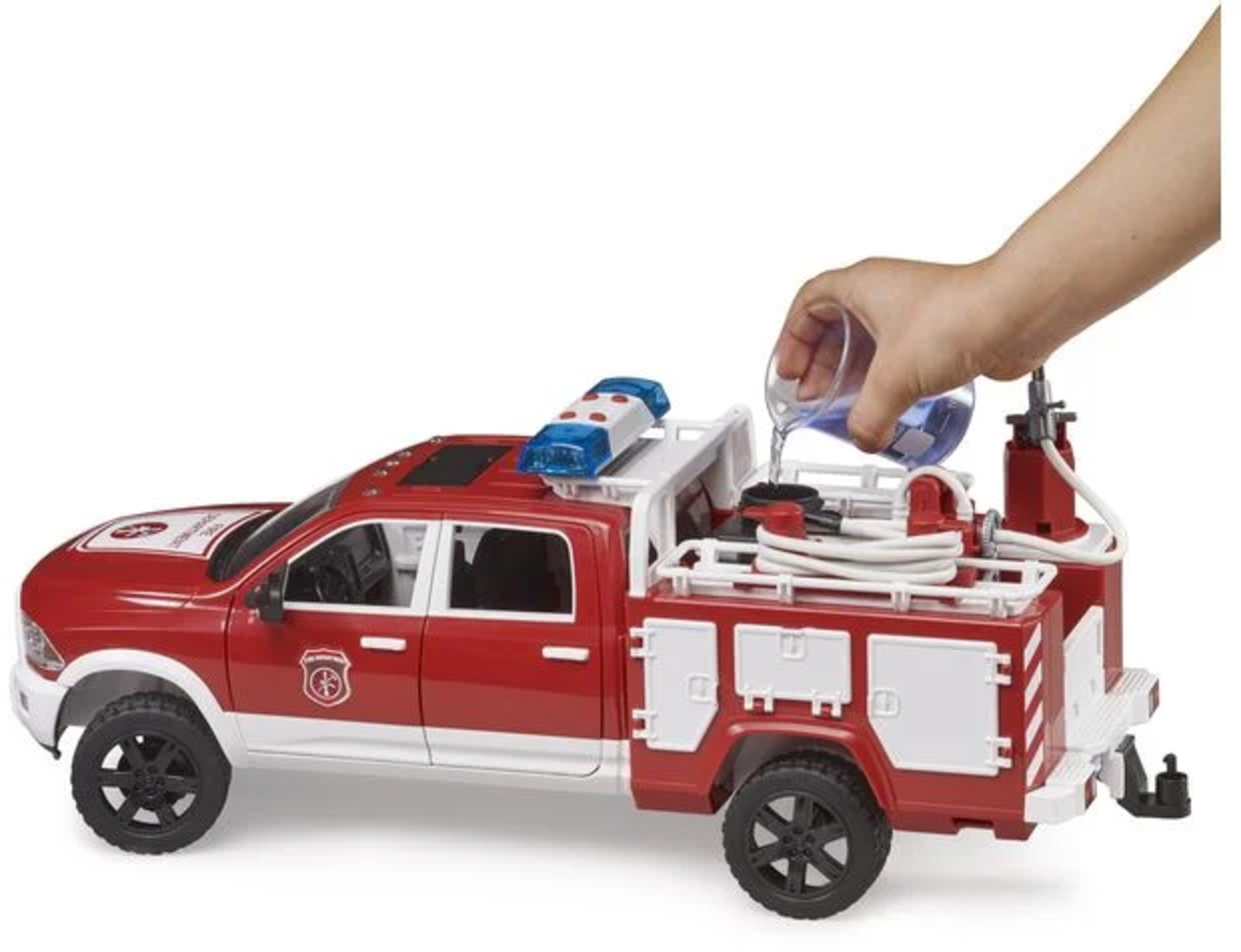 De RAM 2500 brandweerwagen ziet er niet alleen stoer uit, hij nodigt ook steeds weer uit tot afwisselend speelplezier. Dit bedrijfsvoertuig is voorzien van een stuurwielverlenging en een geveerde as. Voor de echt grote klussen kun je een tweede slang op de watertank aansluiten. Dankzij de vele opbergvakken heb je genoeg ruimte voor je gereedschap of je brandblusser.