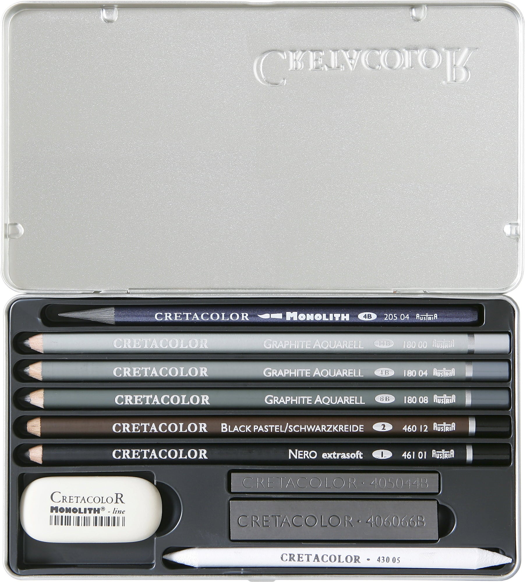 4B monoliet grafietpotlood (wateroplosbaar), 3 wateroplosbare grafietpotloden (HB, 4B, 8B), zwart kleipotlood, zwart extrazacht potlood (waterdicht), 4B grafietstaaf, 6B brede grafietstaaf
