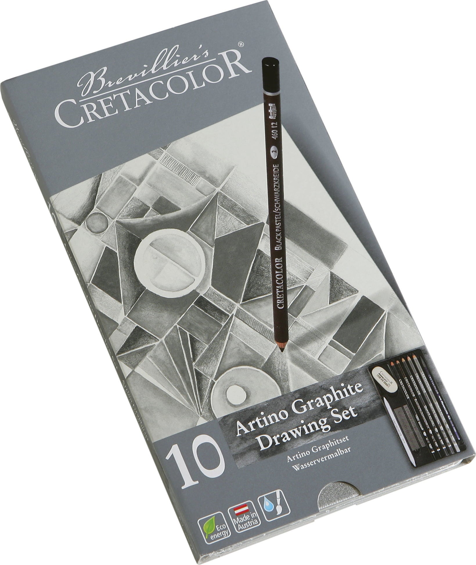 De set "Artino Graphite" bevat in water oplosbare grafietpotloden en een waterdicht zwart extrazacht potlood dat uitstekend geschikt is voor het creëren van scherpe contouren en contrasten.