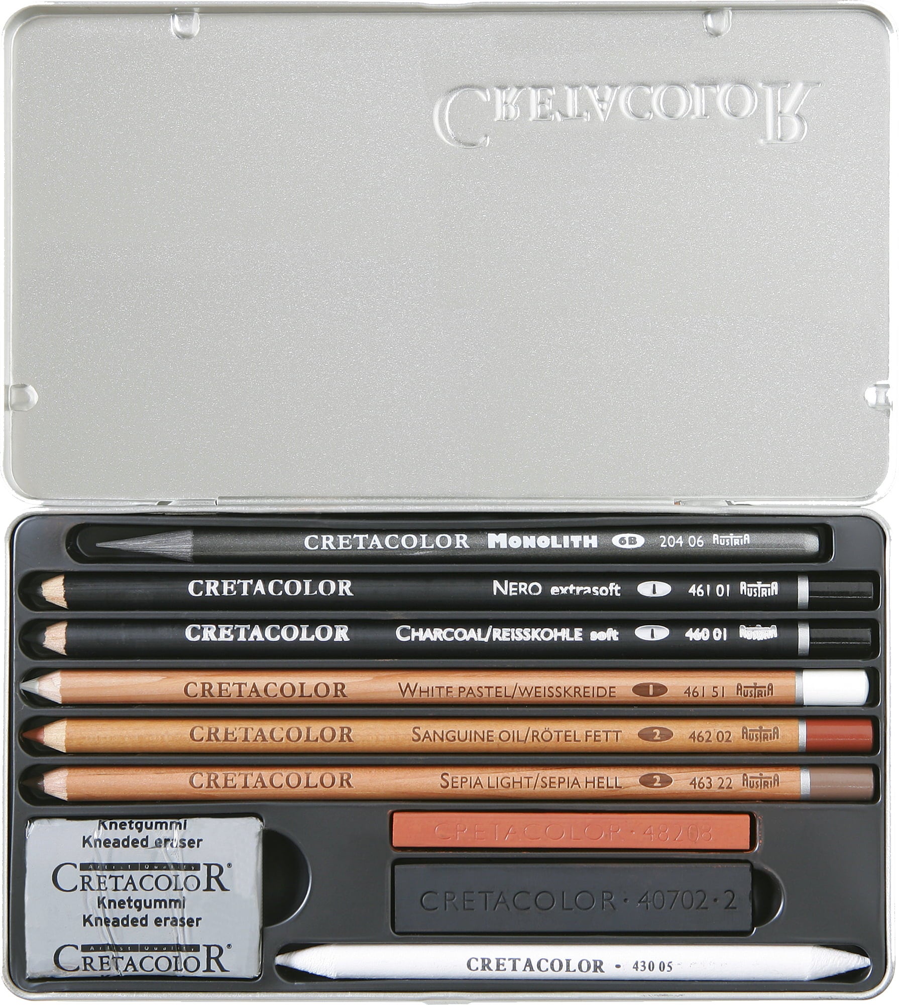 - Kunstenaarspotloden: Monolith Graphite, Nero, Charcoal, White Pastel, Sanguine Oil, Sepia Light