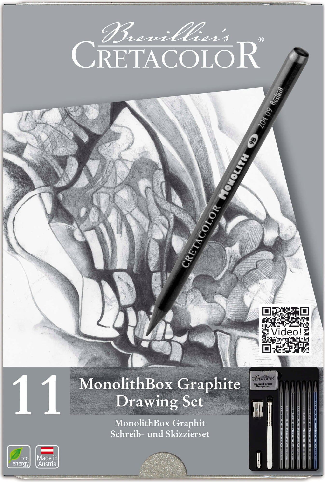 De hoogwaardige metalen doos bevat 6 monoliet grafietpotloden in de gradaties HB tot 9B. Daarnaast zit er een wateroplosbaar 4B Monolith grafietpotlood in de set. Natuurlijk zijn ook de extra accessoires zoals een pennendop, pennenhouder, plasticine en puntenslijper onmisbaar.