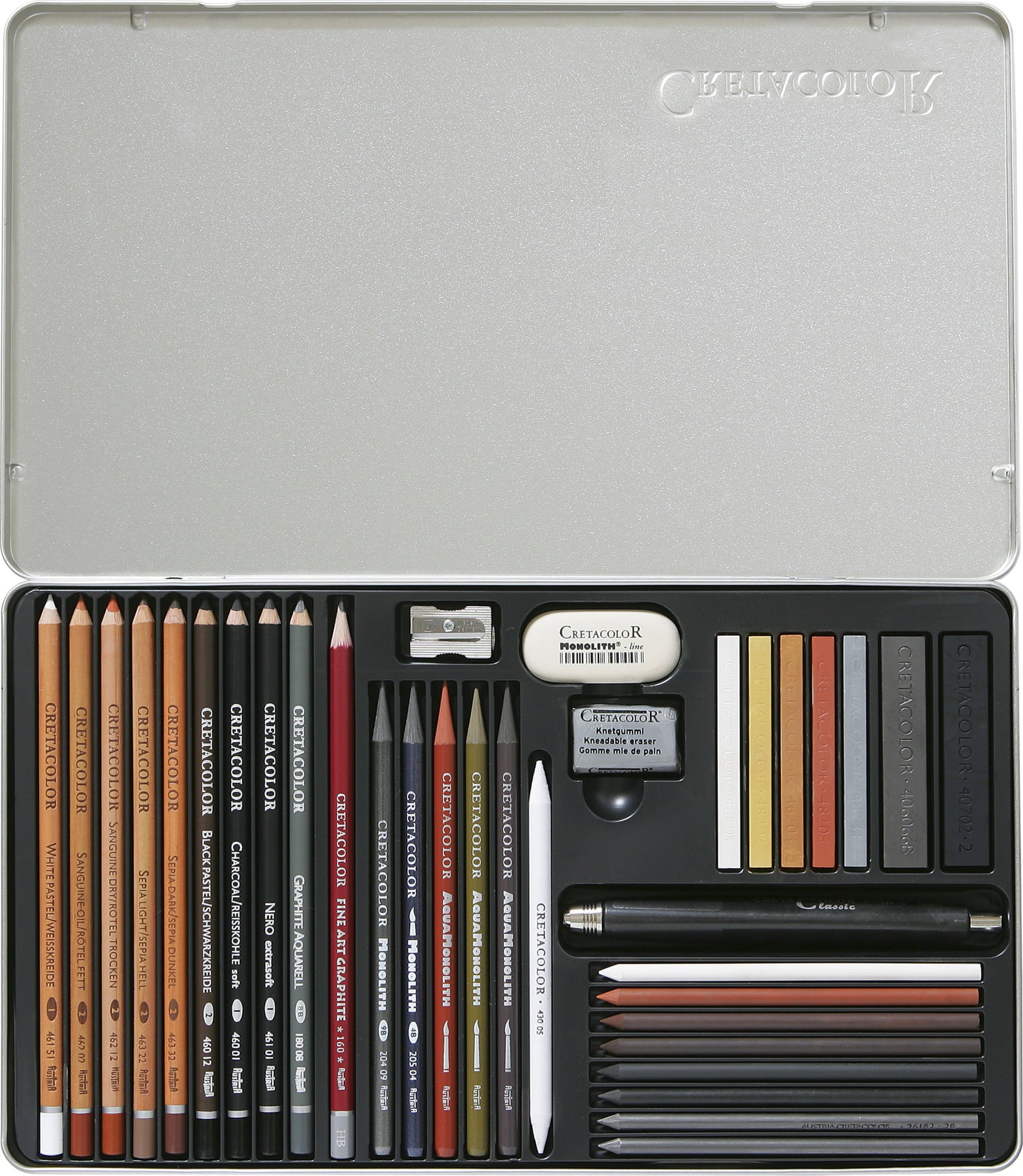 De uitgebreide set kunstmaterialen bevat een up-to-date selectie van hoogwaardige gereedschappen voor tekenen en schetsen.