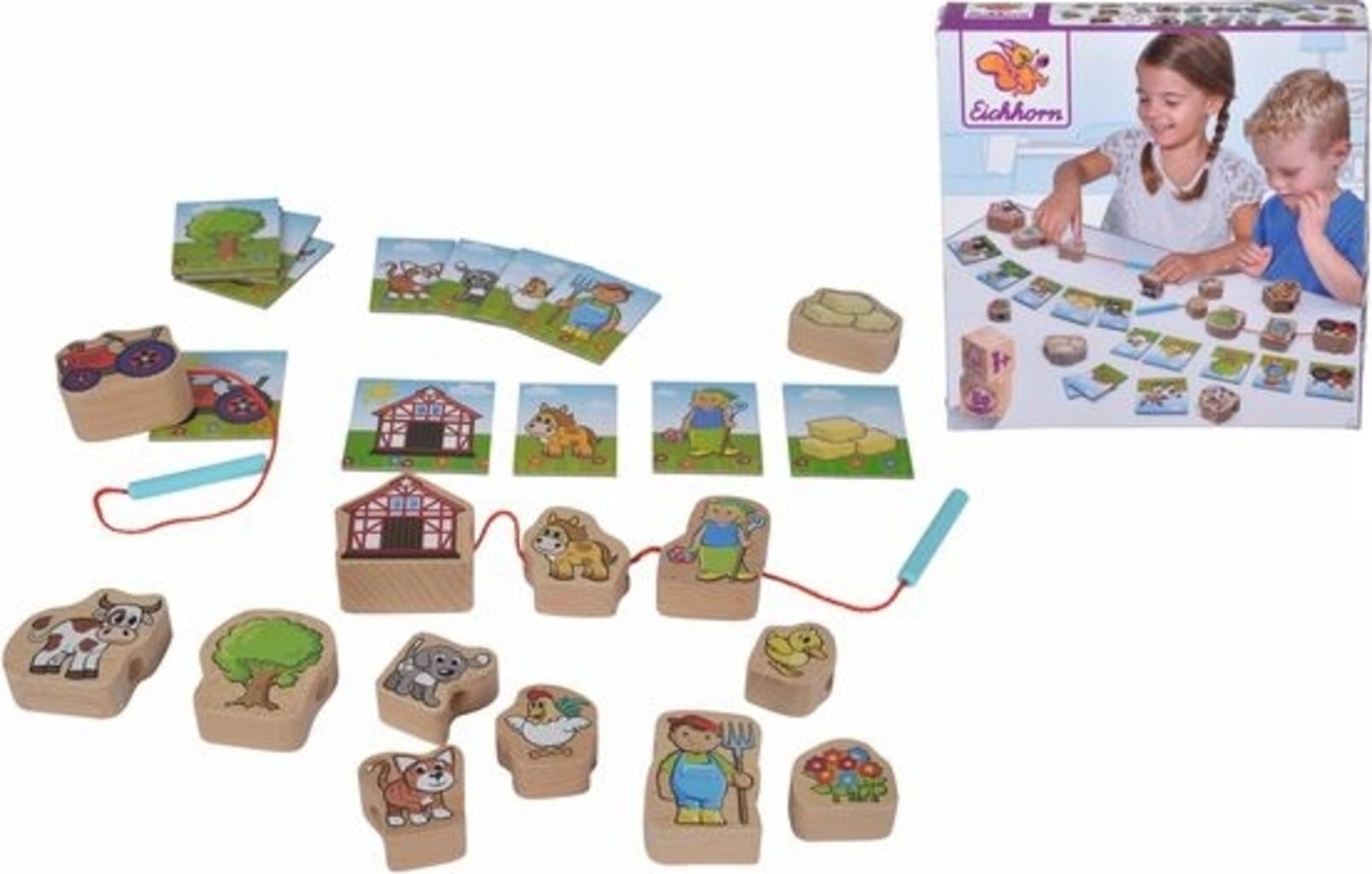 Inhoud: 13 sjabloonkaarten, 11 houten rijgelementen, 2 rijgsnoeren