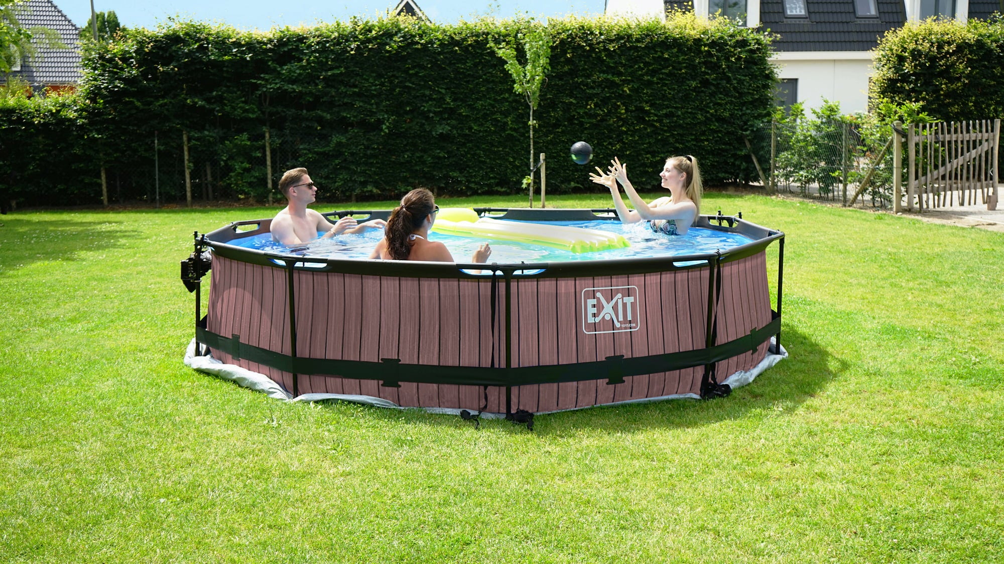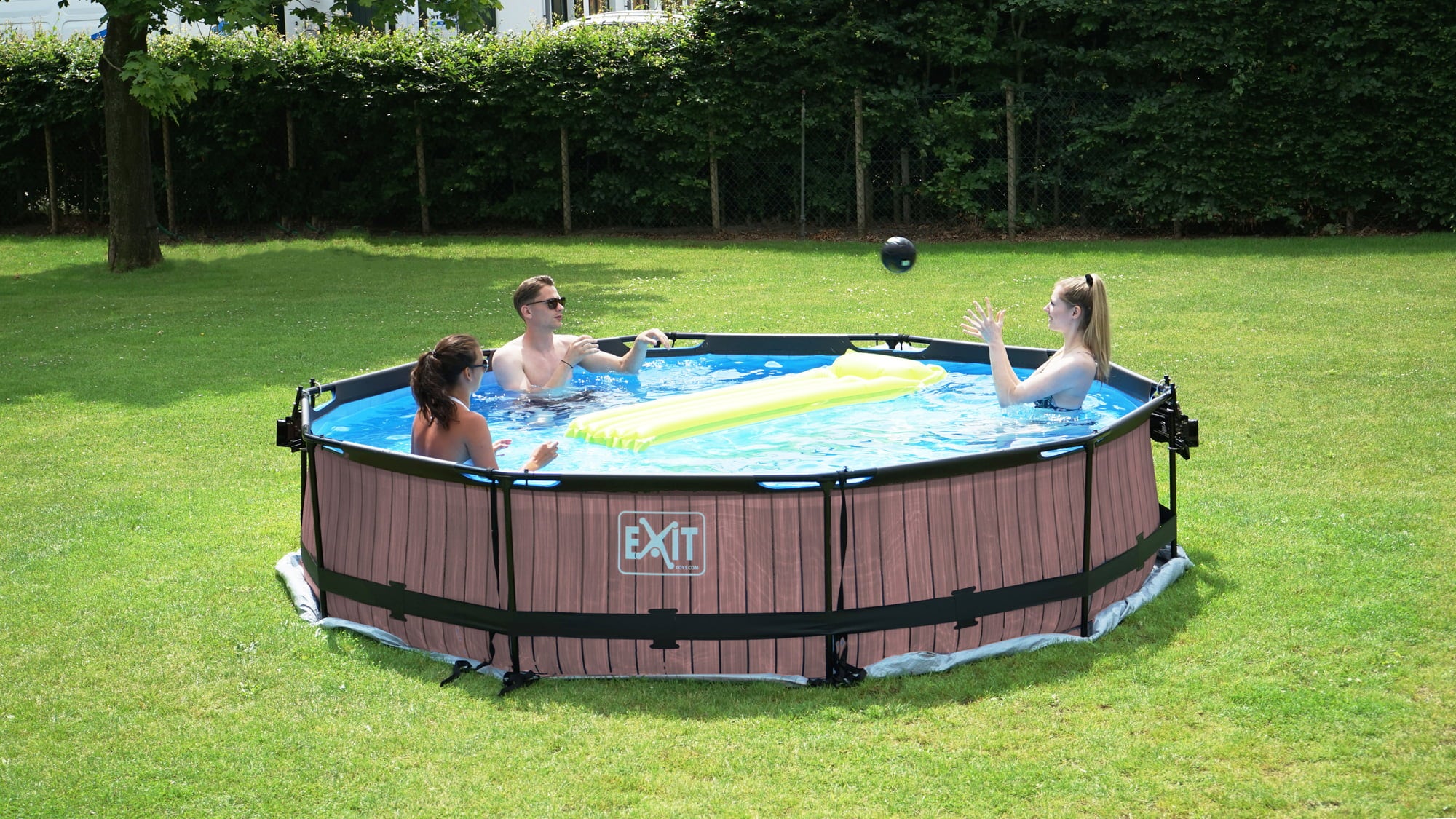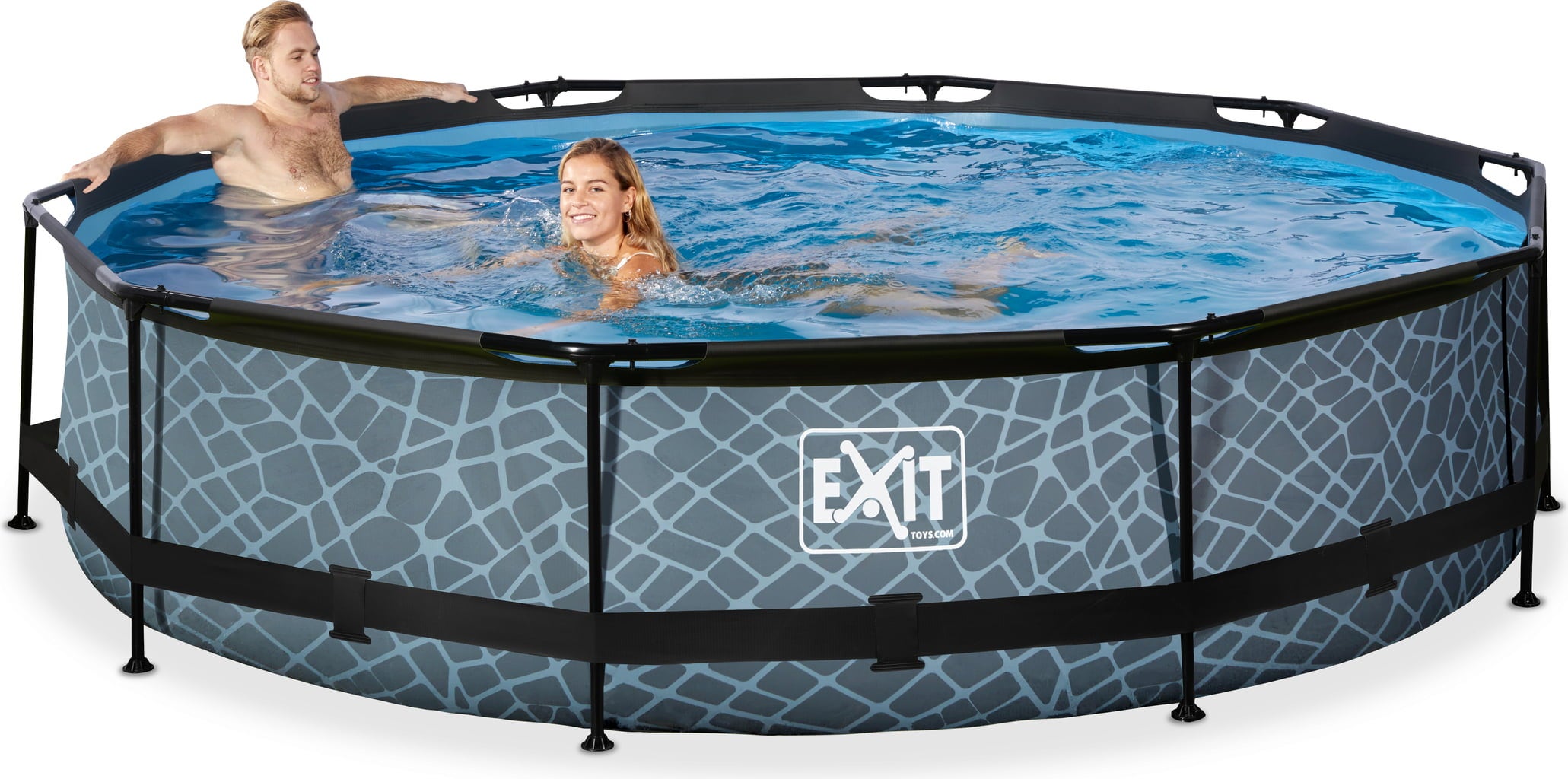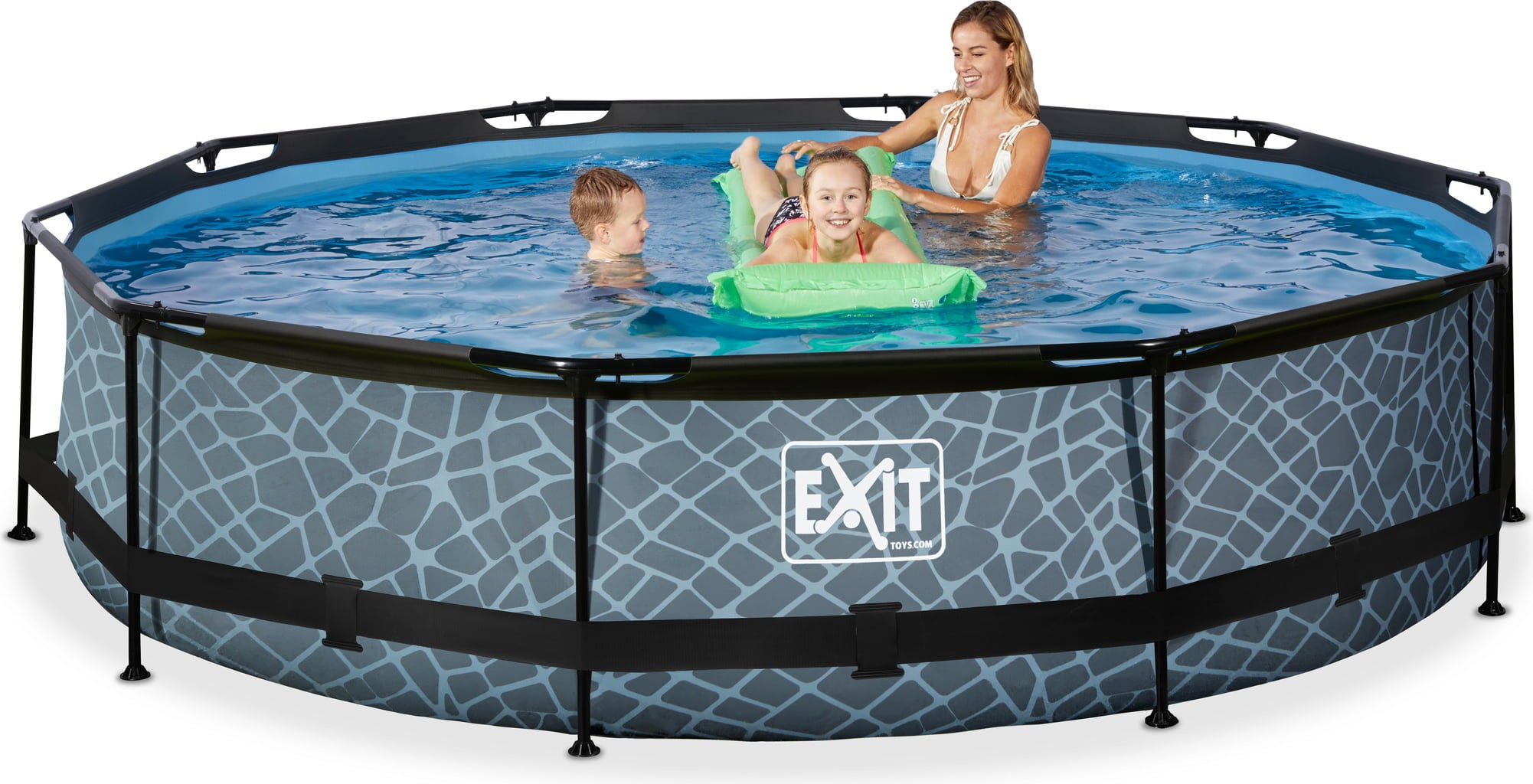 Het grijze frame zwembad van Exit zorgt voor eindeloos speelplezier. Het geweldige steenpatroon maakt het zwembad tot een absolute blikvanger.