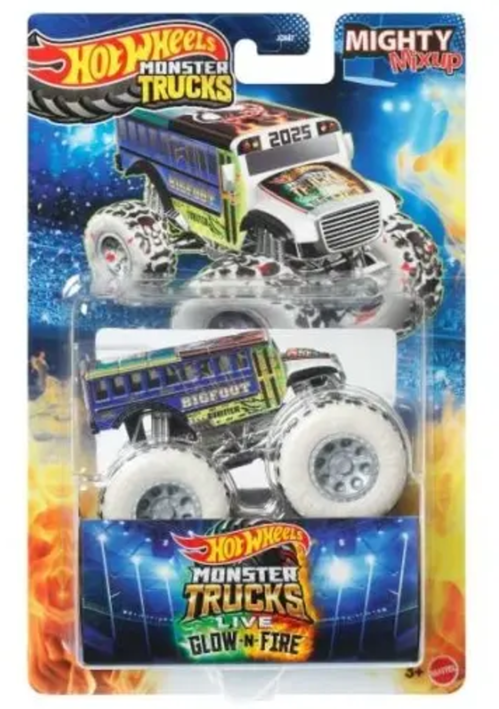 De Hot Wheels Monster Trucks Mighty Mixup - Glow & Fire Edition brengt extra actie in de kinderkamer. Het gedetailleerde Bigfoot-model maakt indruk met zijn robuuste ontwerp en coole glow-effecten die voor wow-momenten zorgen, vooral in het donker. Perfect om mee te spelen en te verzamelen - een echte must-have voor kleine monstertruckfans