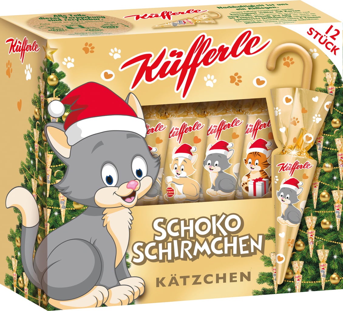 De perfecte kerstboomdecoratie voor iedereen die van chocolade en katten houdt. Zoals gewoonlijk heerlijke Küfferle-chocolade, verpakt in een schattig kitten-design. Al tientallen jaren verrukt Küfferle jongere en oudere generaties met zijn klassieke chocoladeparaplu's.