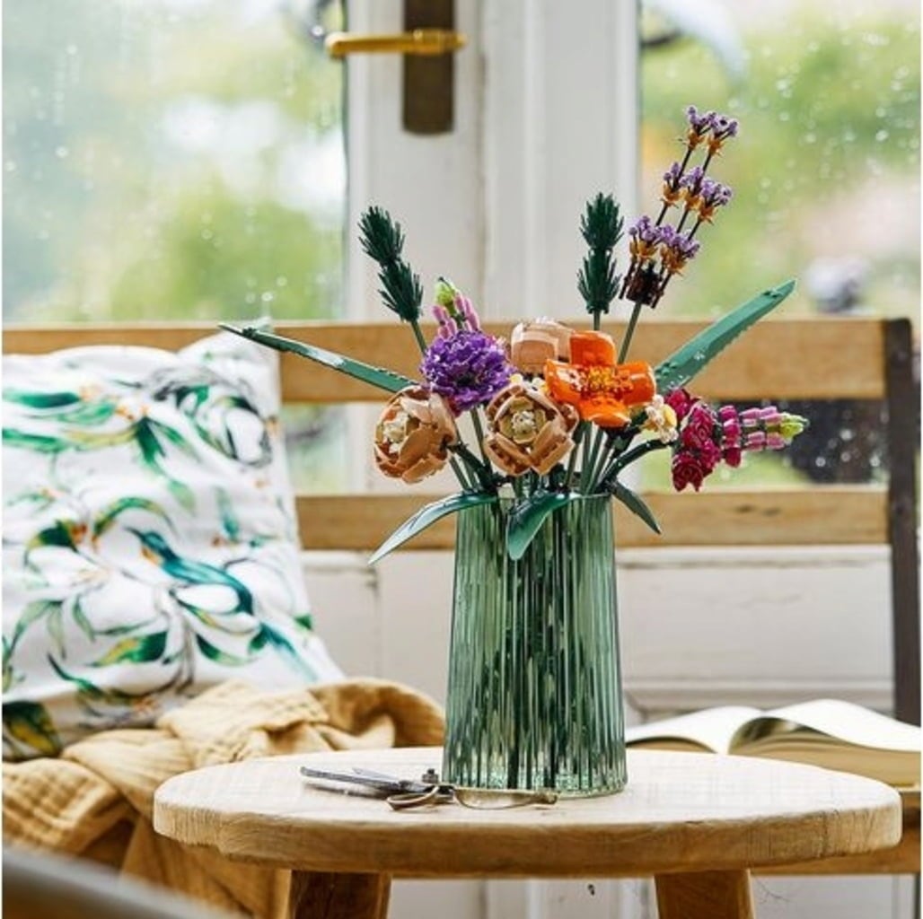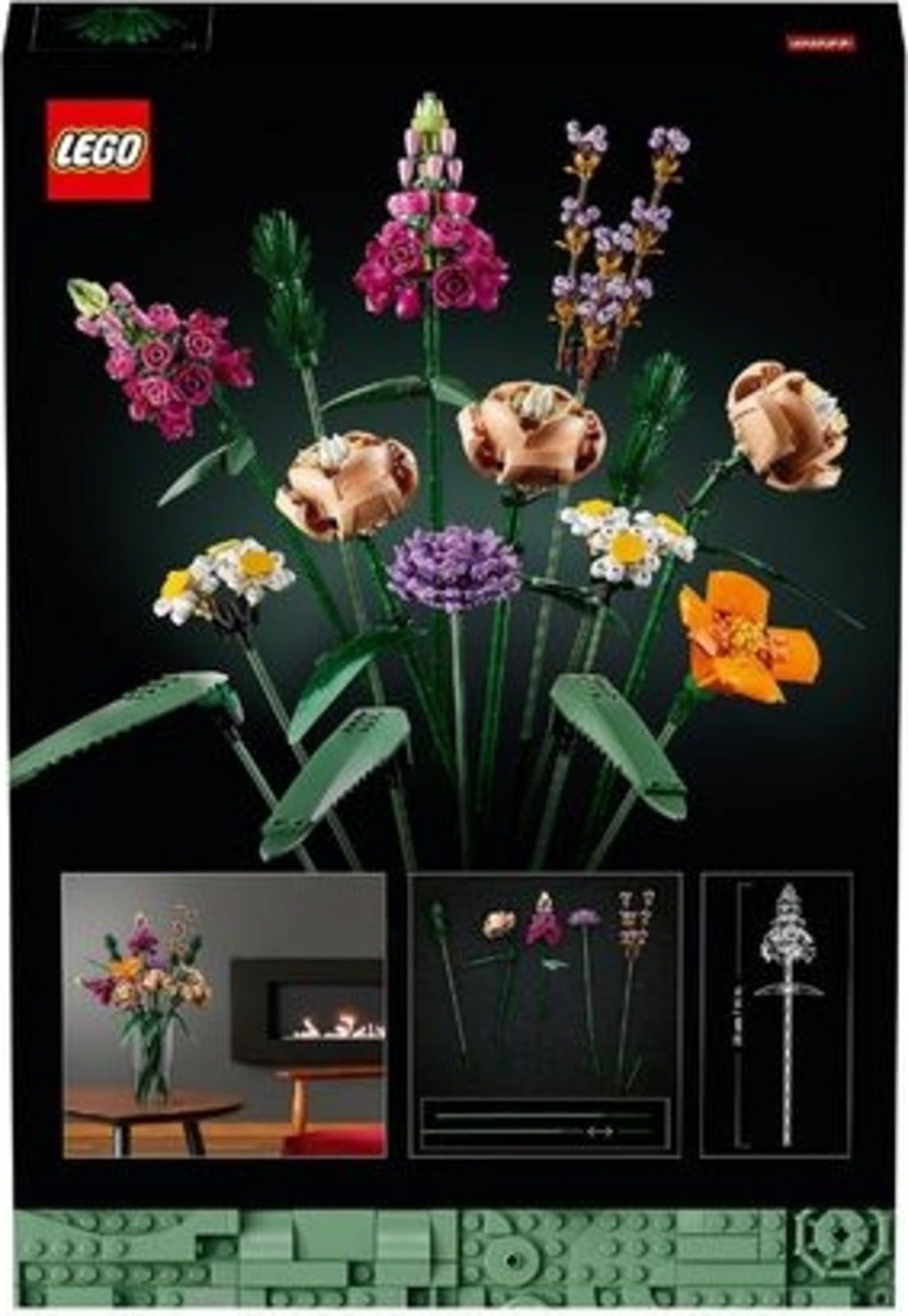 Dit boeket bloeit op elk moment van het jaar. De 17 elementen kunnen steeds opnieuw worden samengevoegd om nieuwe arrangementen te creëren. Bloemen en bladeren hebben realistische vormen en kleuren en kunnen naar wens worden gepositioneerd. Omdat de lengte van de stelen kan worden aangepast, kan elke vaas en pot voor het boeket worden gebruikt. Een kleurrijk cadeau voor iedere LEGO-fan.