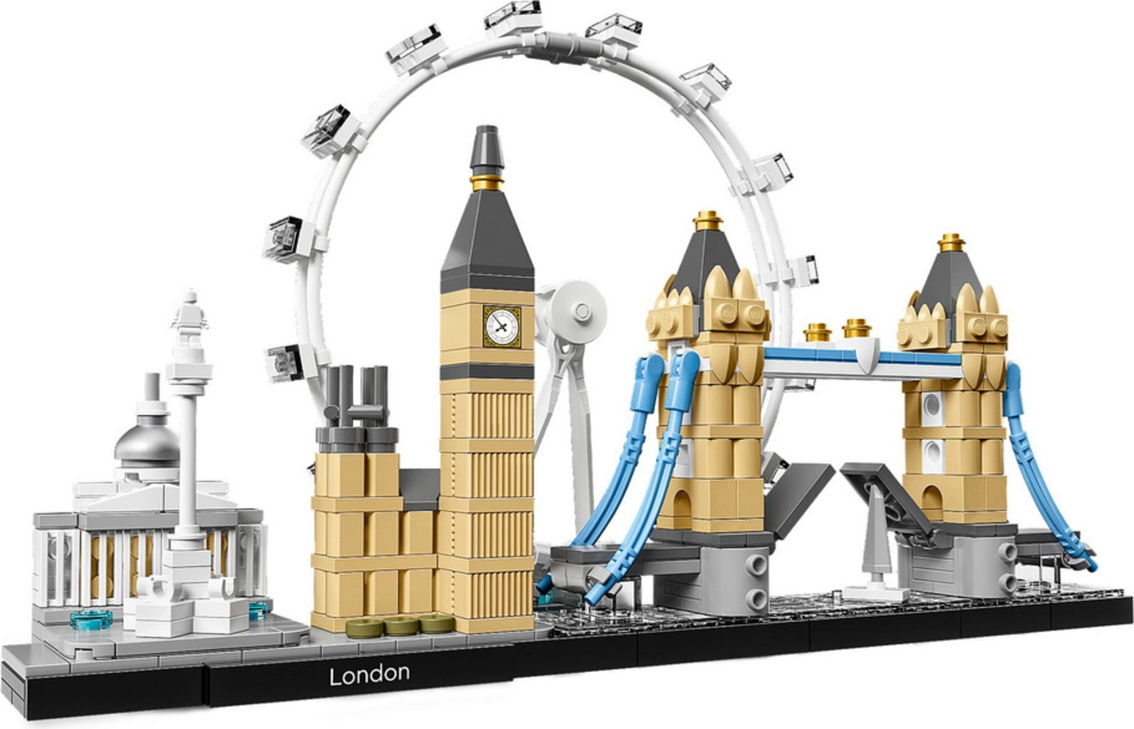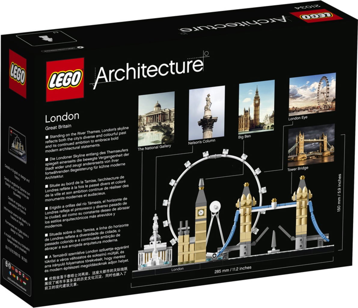 Creatieve ervaring voor liefhebbers van architectuur, design en kunst! Zet zelf legendarische gebouwen en architectonische hoogtepunten van de Engelse hoofdstad in elkaar. Een echt klein kunstwerk dat niet alleen liefhebbers van Londen fascineert. De gedetailleerde modelset uit de LEGO® Architecture-collectie creëert een fascinerende skyline van de Tower Bridge, de National Gallery, Nelson's Column, het reuzenrad en de Big Ben, die wordt weergegeven op een bodemplaat met "London"-letters en transparante "Thames"-panelen. De Tower Bridge kan open om inkomende schepen te verwelkomen.