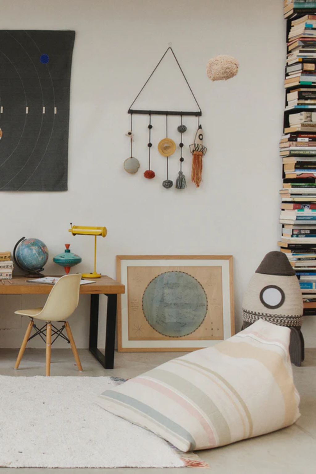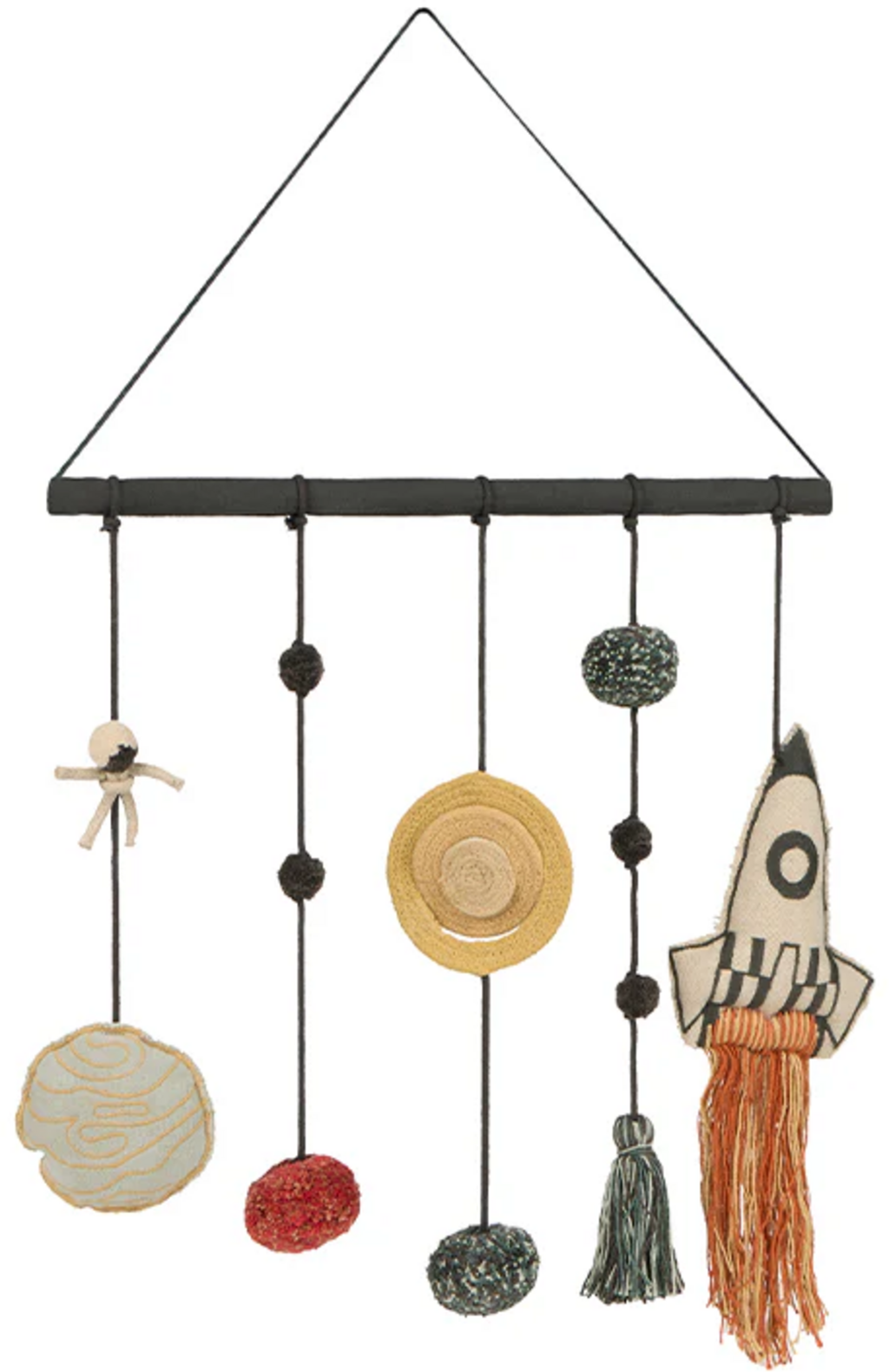 Breng de kosmos in huis! De Cosmos-wandhanger is een handgemaakte wanddecoratie die kinderkamers en woonkamers omtovert in een galactisch decor. Een gedetailleerde astronaut, zwevende planeten en speelse banen creëren een uniek kunstwerk met een space gevoel.
