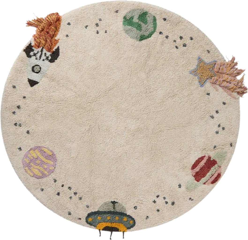 Tover de kamer van je kind om in een galactische avonturenwereld met dit ronde, handgemaakte katoenen vloerkleed. Het gedetailleerde ontwerp heeft drie planeten, een raket, een vallende ster en een UFO - perfect voor kleine ontdekkingsreizigers en toekomstige astronauten!