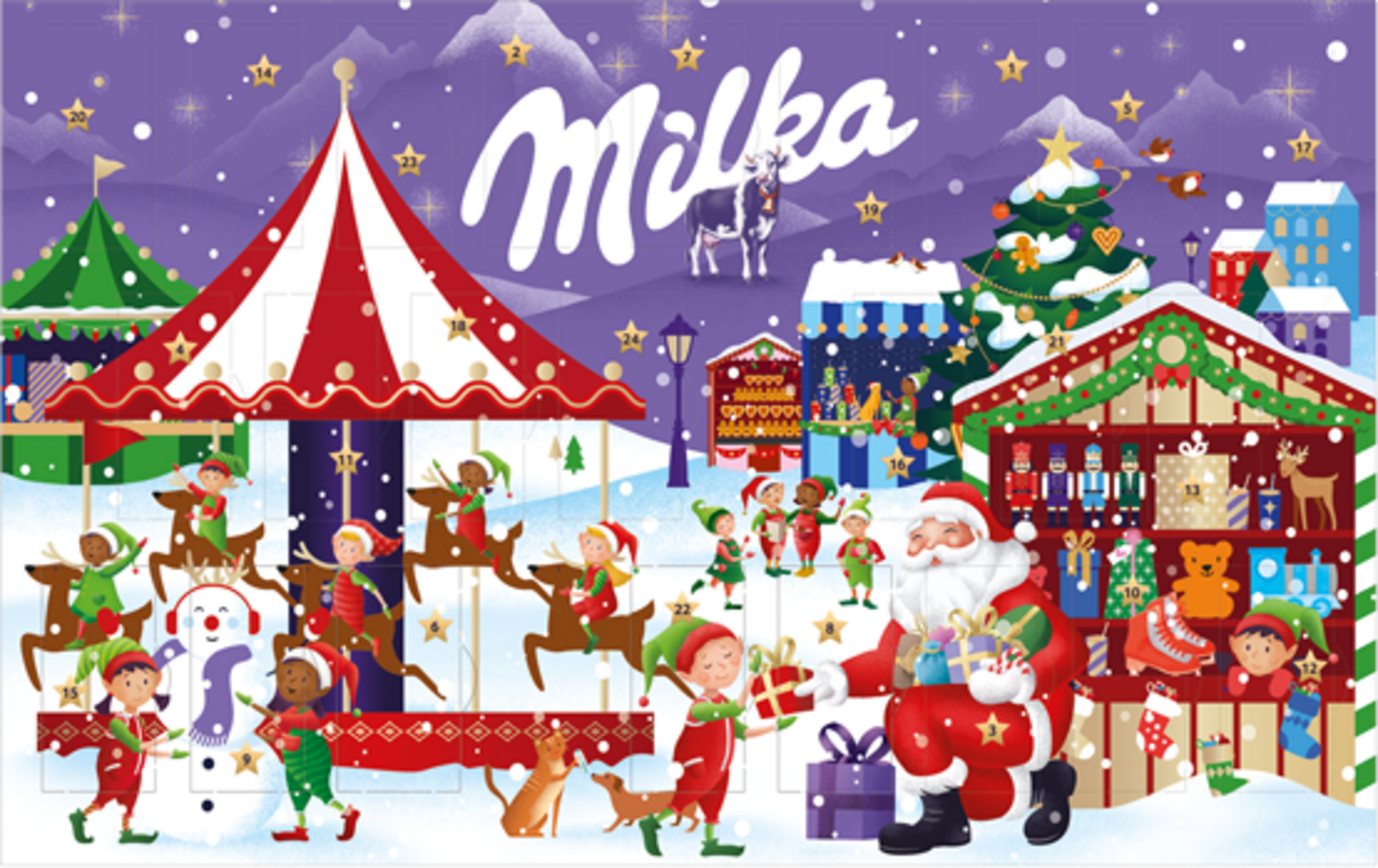 De Milka sneeuwpop bezoekt ook een kerstmarkt met zijn vrienden! Het prachtige winterse tafereel verbergt 24 Milka klassiekers: naps. De kleine chocolaatjes van alpenmelk roepen nostalgische herinneringen op en zijn verrukkelijk met de typische Milka-smaak.