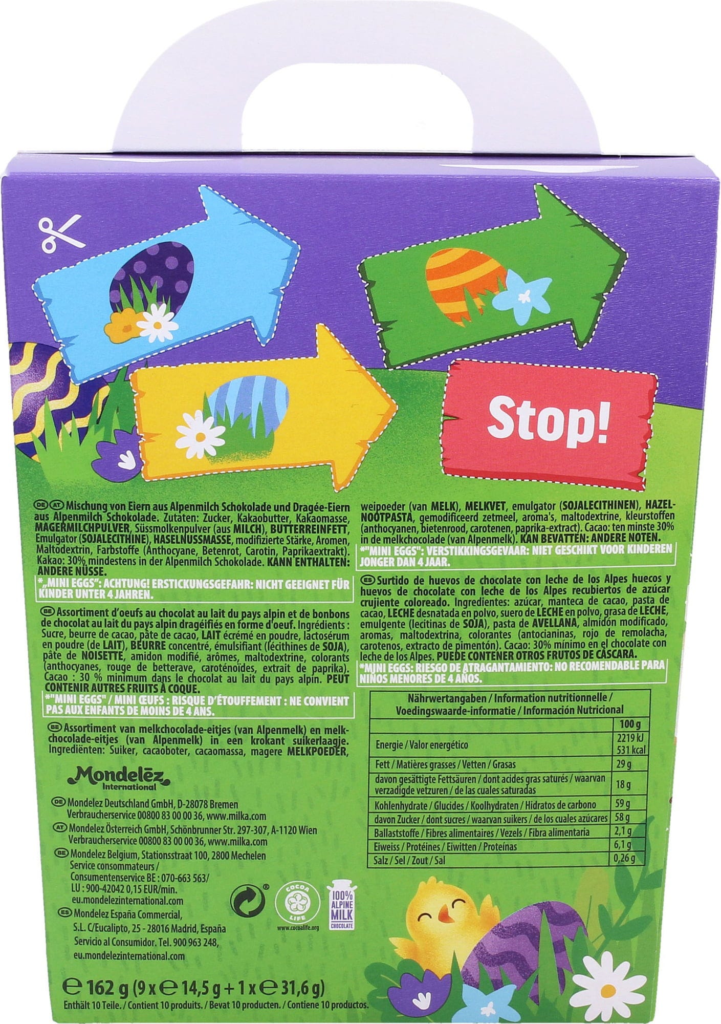 9 Alpen-volmelkchocolade-eitjes in folie met een vrolijk patroon, uiteraard elk afzonderlijk verpakt, plus een zakje vol mini dragee-eitjes – perfect om je paasmandjes kleurrijk te vullen. Aan de achterkant kun je kleine kaartjes uitsnijden, bijvoorbeeld voor namen of paaswensen. Zo maak je in een handomdraai de mooiste paasmandjes, ver en wijd! 🐣🍫