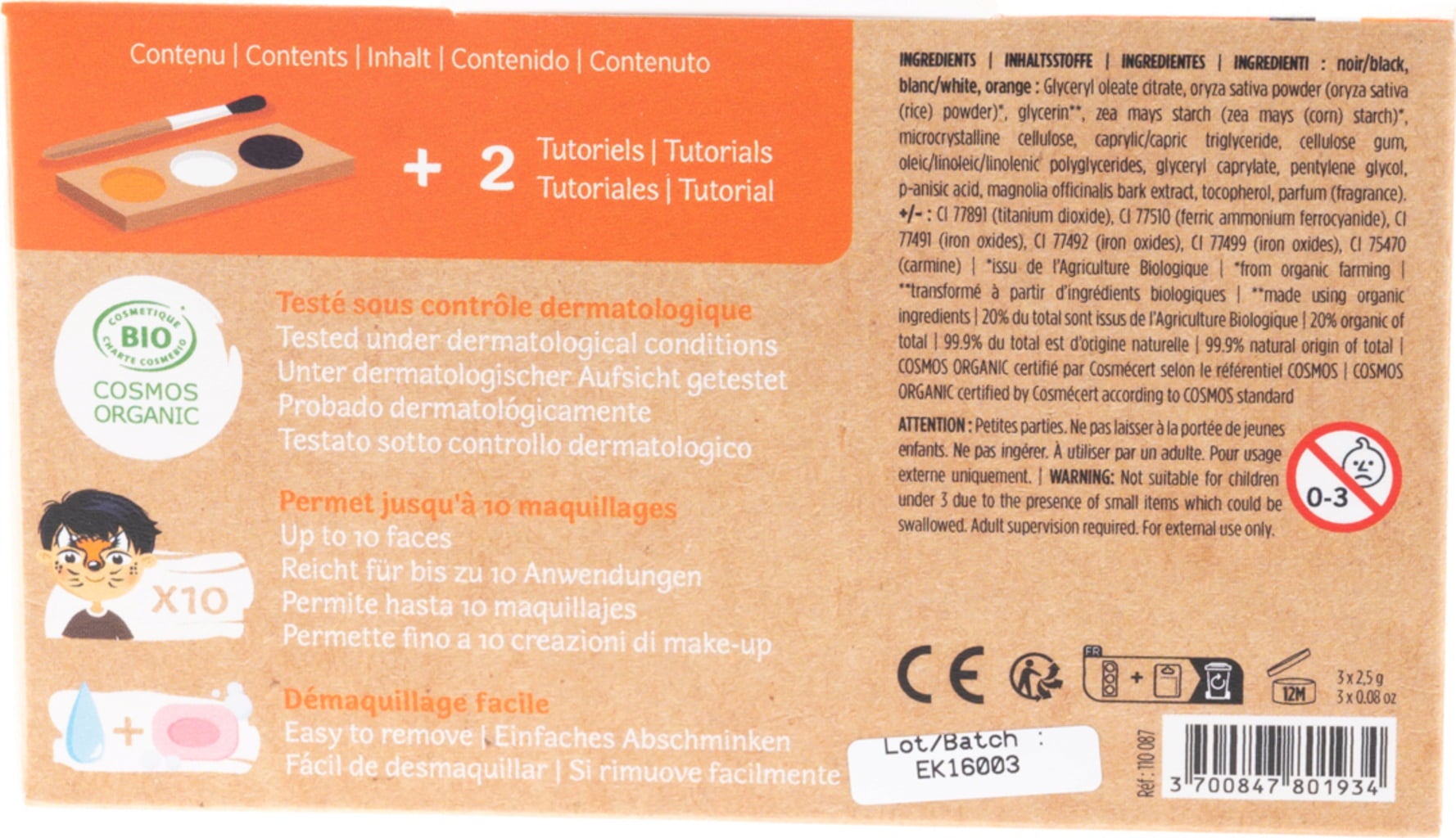 Met de kleur zwart, wit en oranje transformeer je eenvoudig in tijger of vos! De formules zijn hypoallergeen, zacht voor de huid en gemakkelijk afwasbaar.