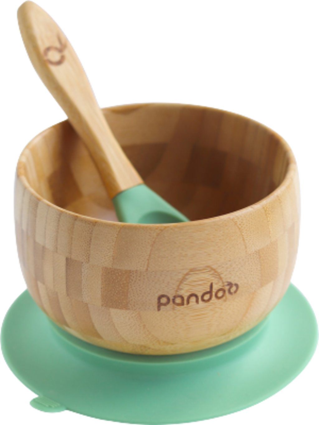De liefdevol vormgegeven set bestaat uit een bamboebord in de vorm van een pandagezicht en een bamboekom, die beide veilig en antislip op tafel staan ​​dankzij slimme onderstellen met turquoise en gele siliconen.