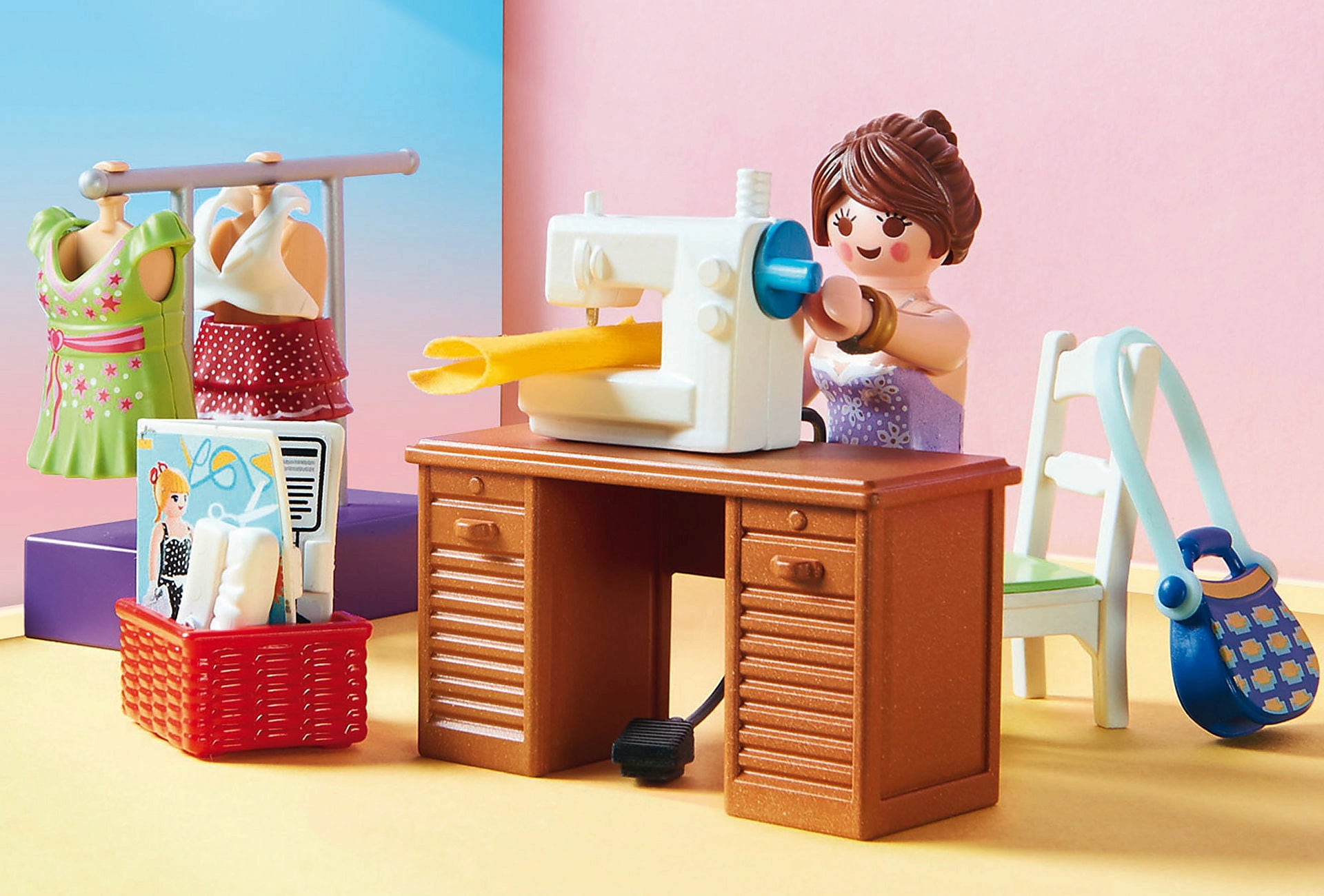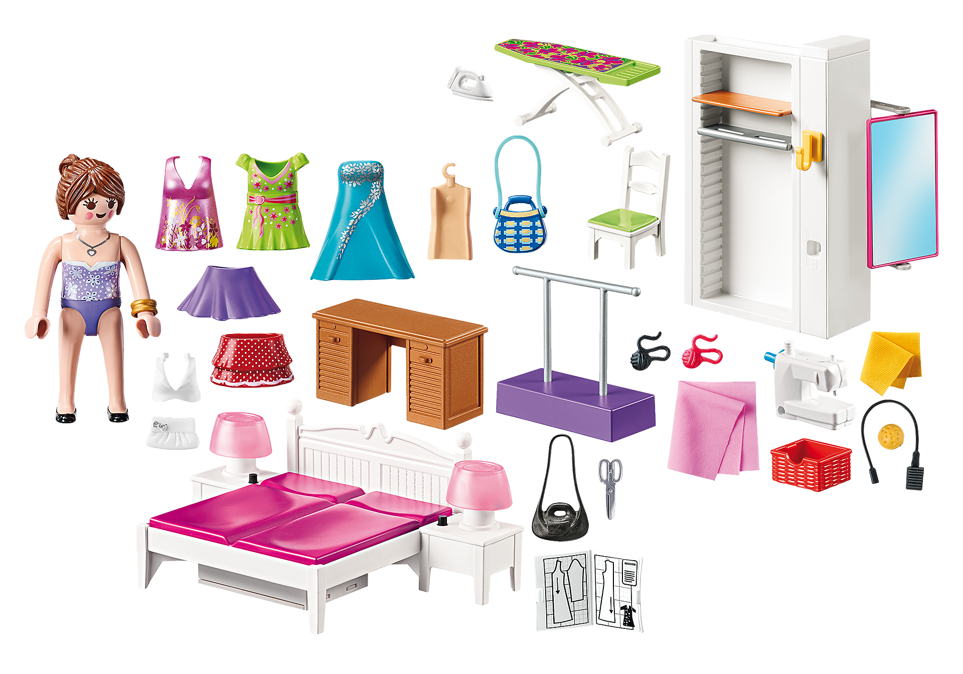 Deze modern ingerichte slaapkamer is niet alleen een ideale plek om te ontspannen, maar doet ook dienst als kleermakersatelier waar dromerige jurken, rokken en accessoires worden gemaakt. De Playmobil-dame past al haar creaties zelf en kijkt trots naar haar outfits in de spiegel. Dankzij haar creatieve inslag is ze nu perfect gekleed voor elke gelegenheid!