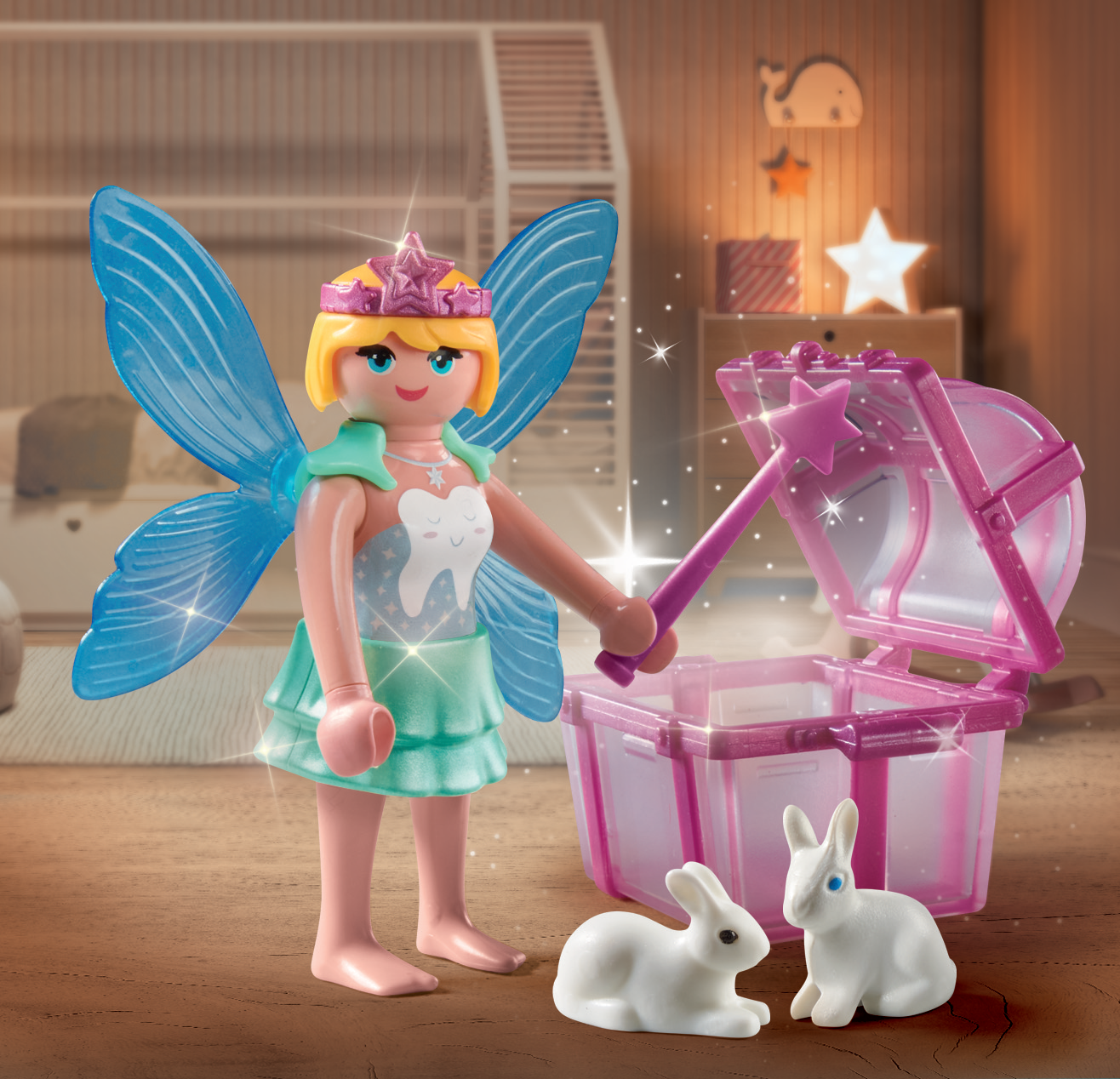 Tandenfee met toverstaf, schatkist en 2 konijnen.