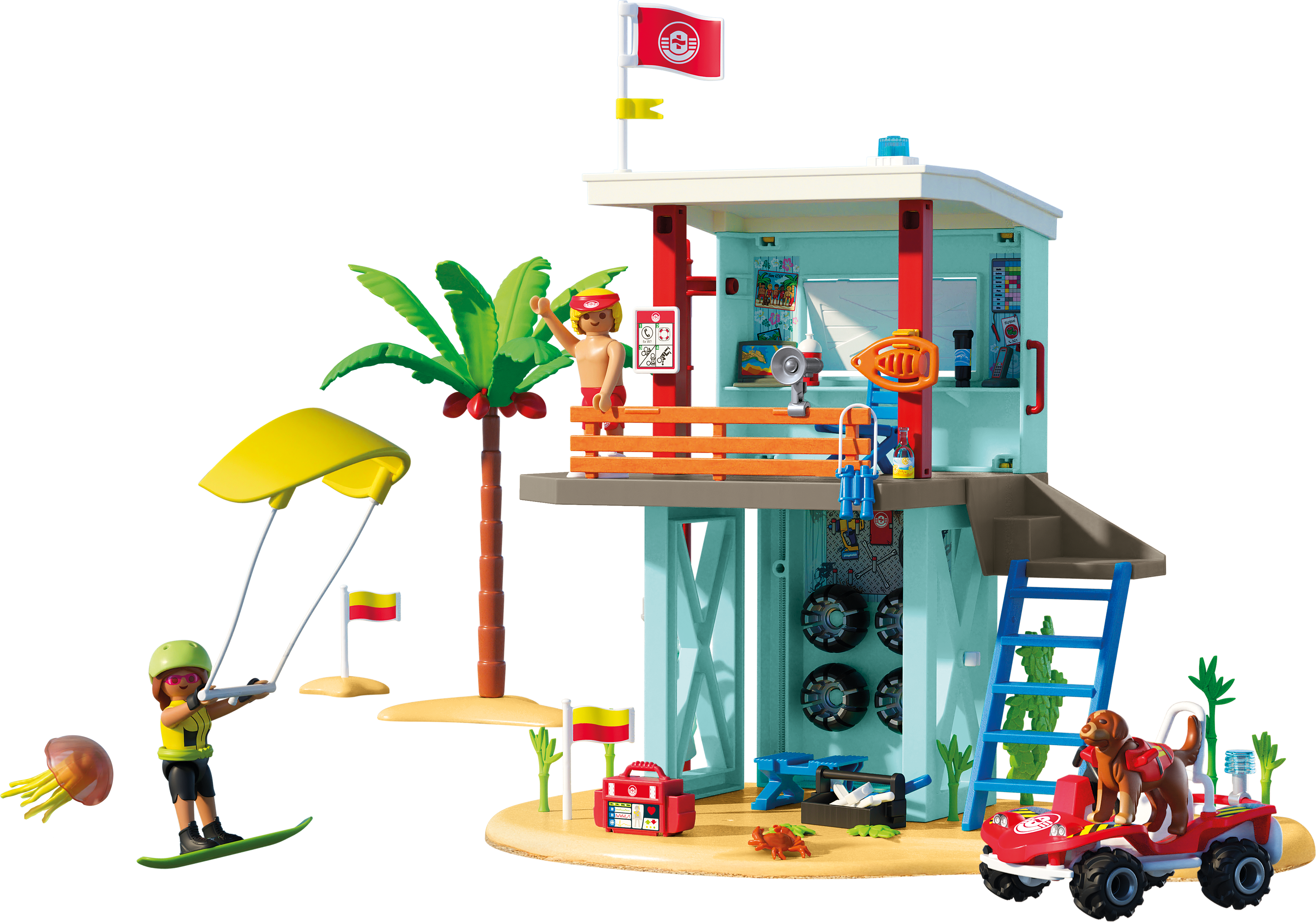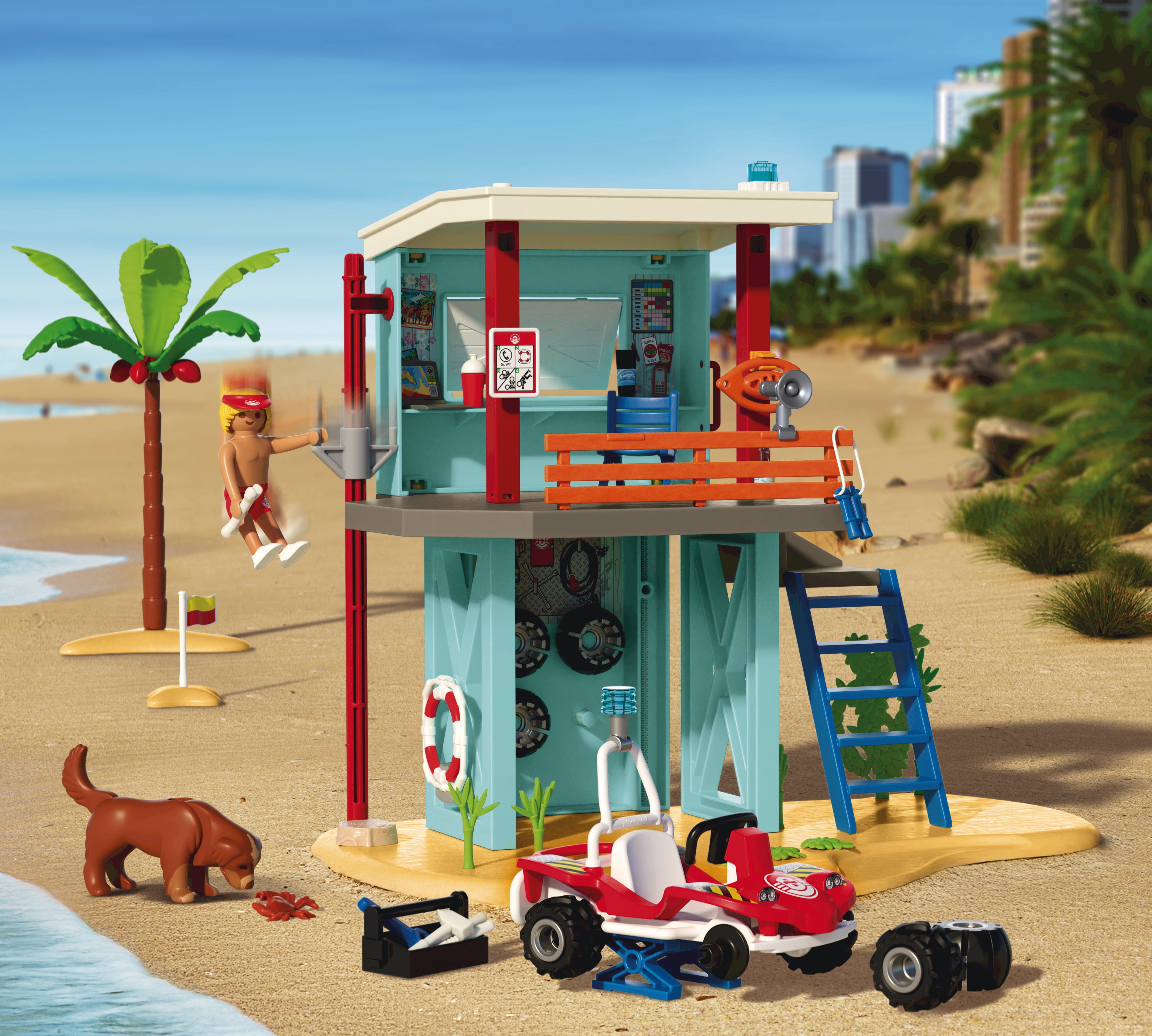 Inhoud: 1 man met schildkap, 1 vrouw met helm, 1 hond met reddingsvest, 1 krab, 1 vuurkwal, 1 reddingstoren met reddingspaal en trap, 1 klapstoel, 1 laptop, 1 telefoon, 1 drinkbeker met rietje, 1 drinkfles, 1 zonnebrandcrème, 1 EHBO-kit met uitrusting, 1 reddingsplank, 1 megafoon, 1 waarschuwingslicht, 1 vlag, 2 waarschuwingsvlaggen, 1 staande vlag, 1 hefplatform, 1 gereedschapskist met toebehoren, 1 set reservebanden, 1 strandbuggy, 1 reddingsboei, 1 vliegerparaplu, 1 vliegerstang