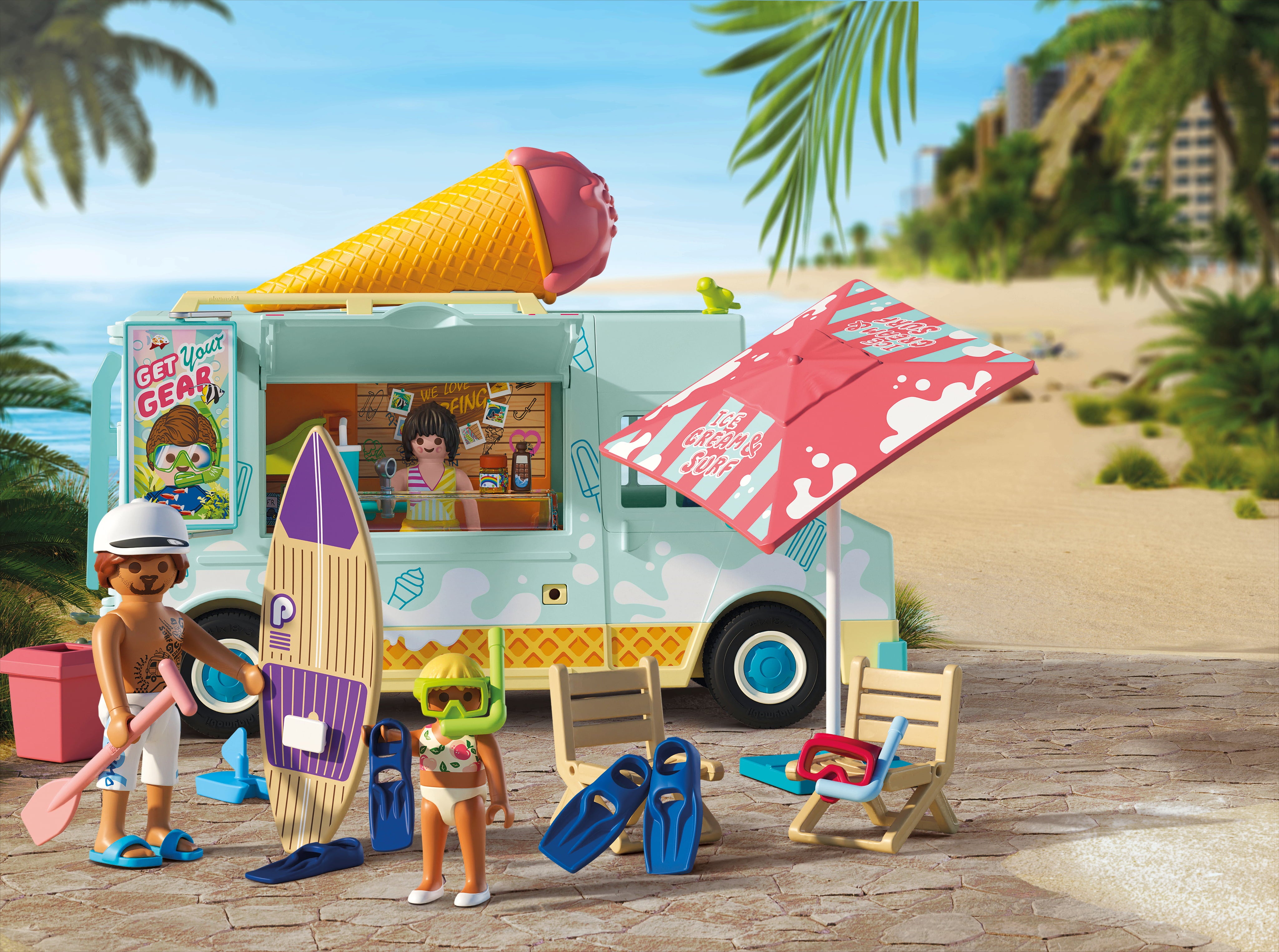 Inhoud: 1 vrouw, 1 man met pet, 1 meisje, 1 vogel, 1 vrachtwagen met grote ijshoorn op het dak, 1 ijscobalie met aardbeien-chocolade en vanille-ijs, 1 glas met deksel, 1 buis, 1 drinkbeker met rietje, 2 ijshoorntjes met verschillende insteekbare ijsschepjes, 1 surfplank, 1 peddel, 2 zwemvliezen, 2 duikbrillen met snorkel, 3 dozen fruit, 1 parasol, 2 klapstoeltjes, 1 prullenmand, 1 speelzeilboot, 1 ijsschep lepel