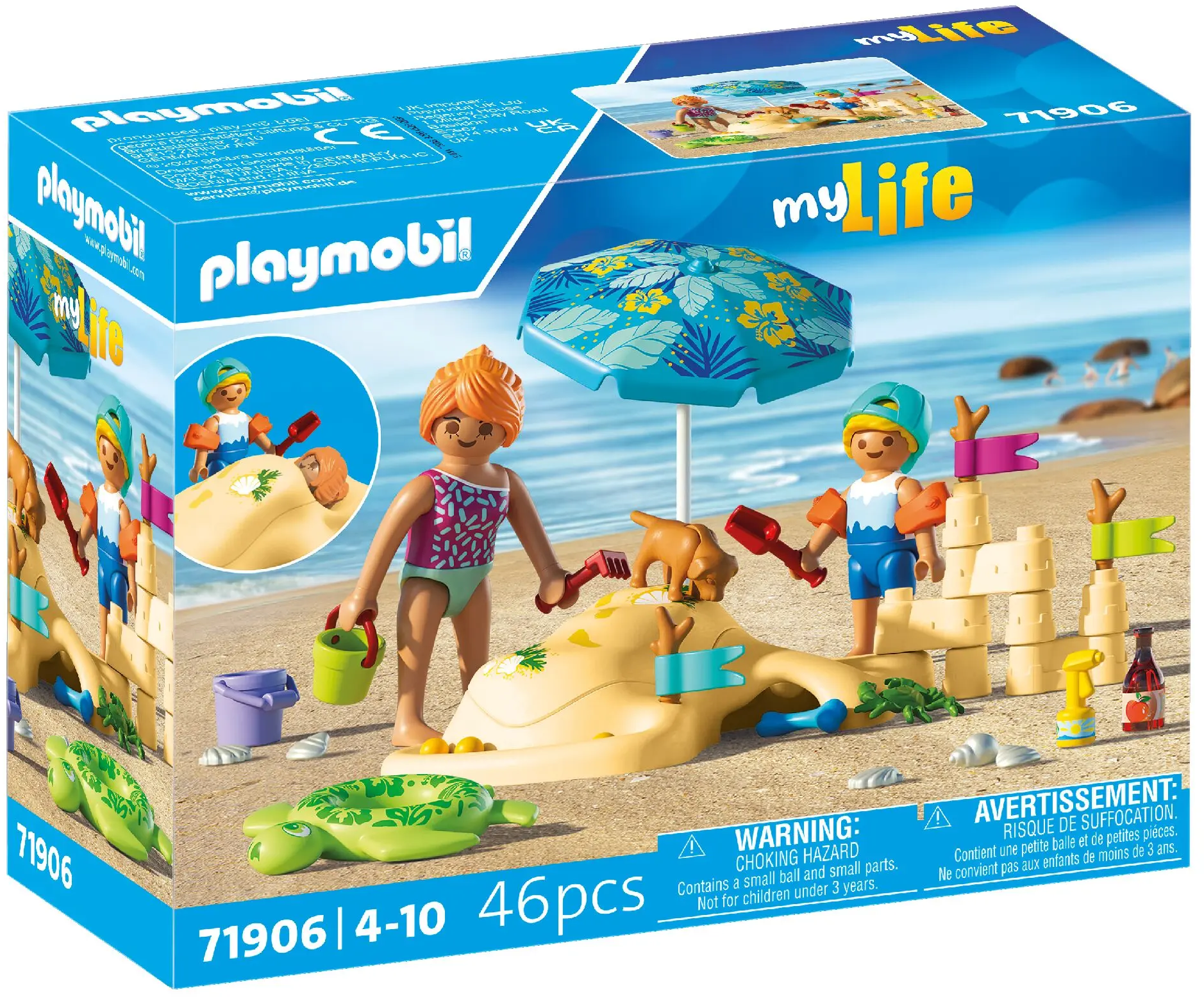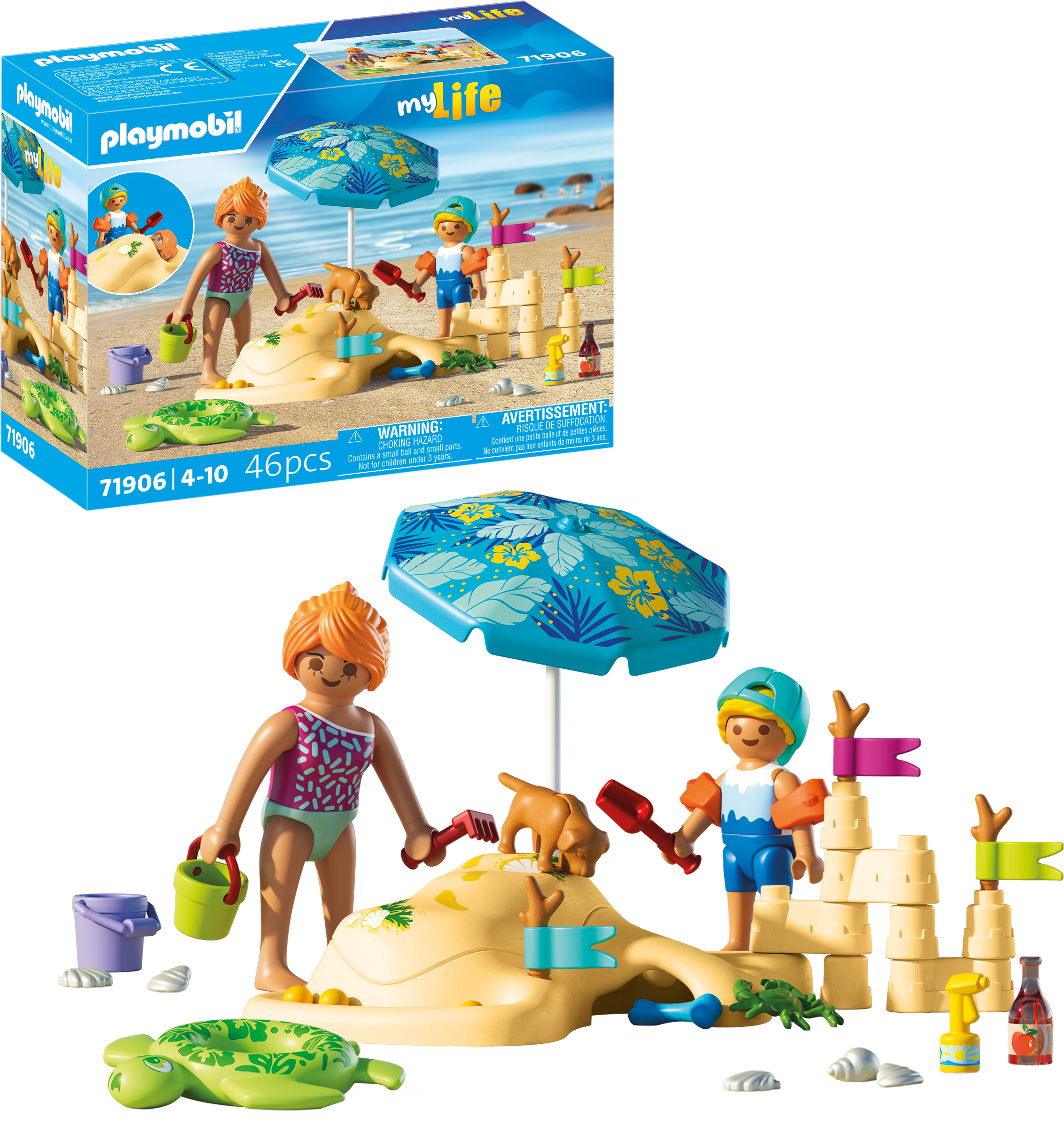 Inhoud: 1 vrouw, 1 jongen met pet, 1 hond, 1 krab, 1 strandelement met afneembaar deksel en losse zandkasteelelementen, 1 parasol, 3 vlaggen aan een tak, 3 knikkers, 1 set schelpen, 1 drinkfles, 1 zonnebrandcrème, 1 emmer met schep en hark, 1 zwemband en watervleugels