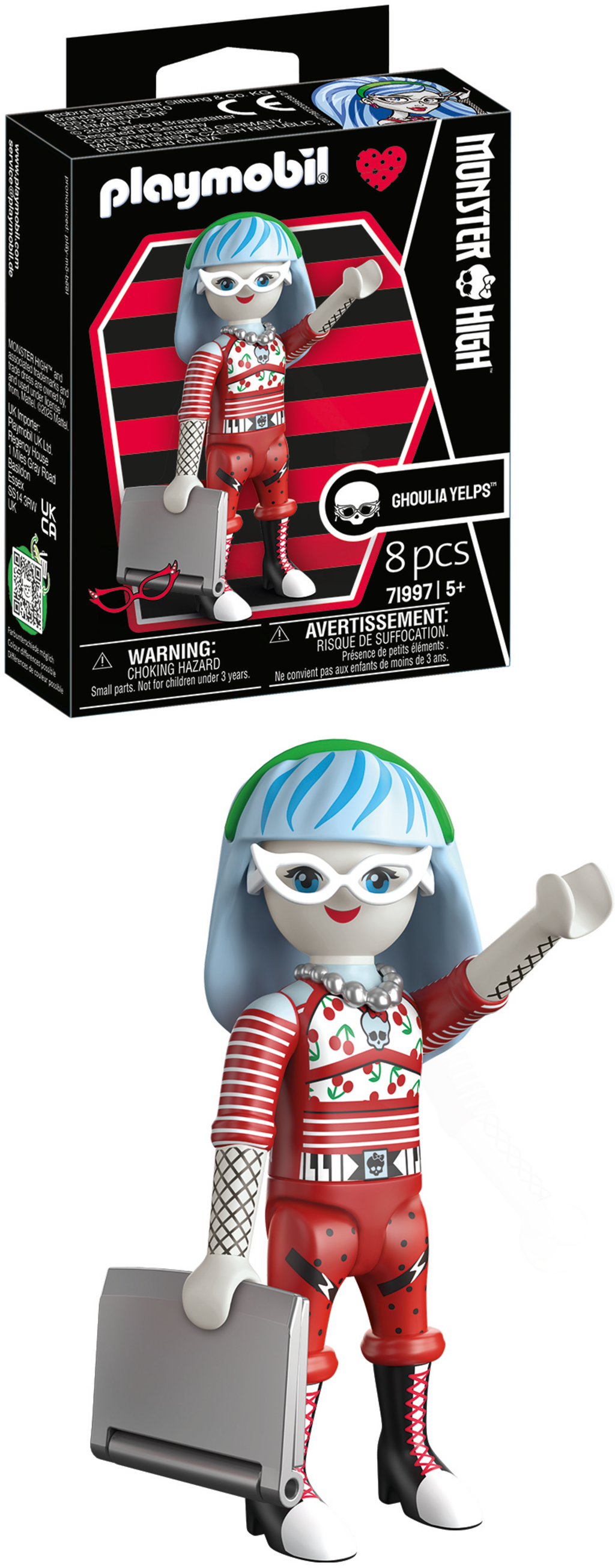 Recht uit de gangen van Monster High ™, de slimste ghoul van de school komt nu naar je huis als een gedetailleerde PLAYMOBIL figuur. Ghoulia Yelps is direct herkenbaar aan haar iconische look. De kenmerkende bril, de strengen blauw haar en haar onmisbare ghoul tech laptop mogen natuurlijk niet ontbreken. Met deze figuur kun je de eng-coole momenten uit de serie naspelen of compleet nieuwe avonturen verzinnen voor de slimme scholiere. Dankzij de modulaire PLAYMOBIL onderdelen kan Ghoulia worden aangepast voor elke scène, of het nu gaat om het oplossen van digitale puzzels of het afspreken met haar vrienden.