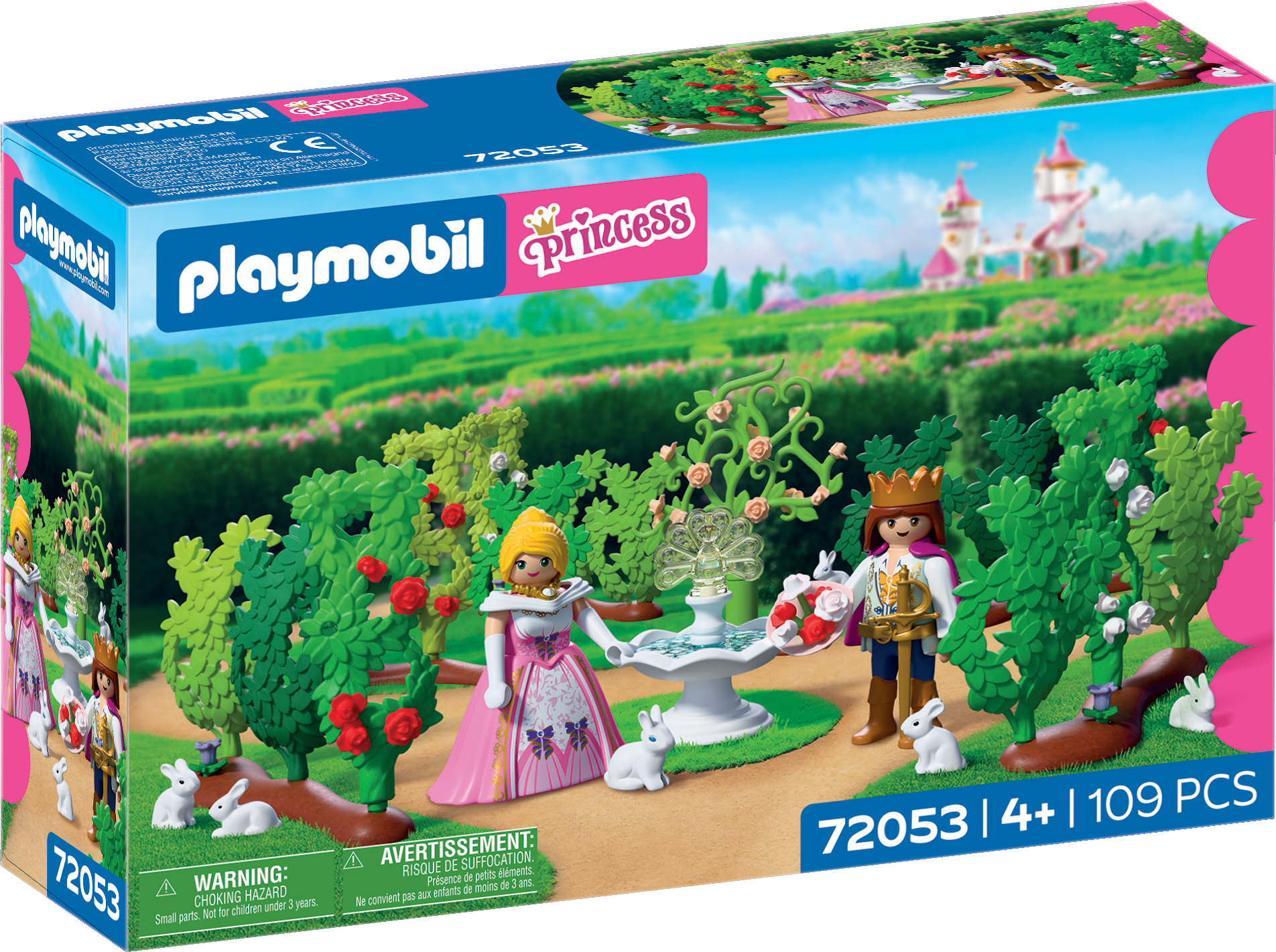 In het PLAYMOBIL Koninklijk Doolhof sluipt de prins door kronkelende heggen en geurige bloemen om de prinses een boeket bloemen te overhandigen. Schattige konijntjes wijzen de weg, terwijl bewegende heggen en wijnranken steeds nieuwe paden en mysterieuze hoekjes openen.