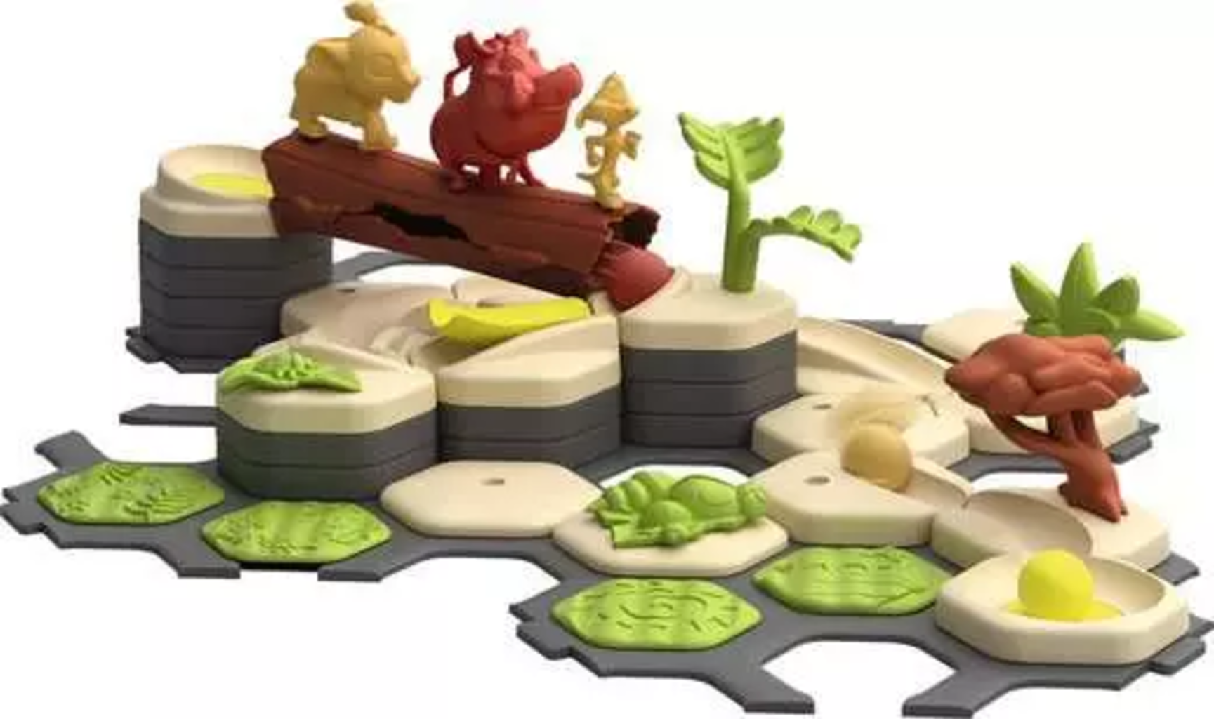 Wanneer Simba, Pumbaa en Timon over de paden jagen en de grote boomstam passeren, wordt de knikkerbaan het decor voor fantasierijke verhalen. Terwijl de kinderen de kleurrijke figuren plaatsen en de baan vrij vormgeven, ontwikkelen ze ook hun fijne motoriek en ruimtelijk inzicht. Het observeren van de rollende ballen zorgt ook voor een eerste begrip van het principe van oorzaak en gevolg - educatief waardevol en vol speelplezier.