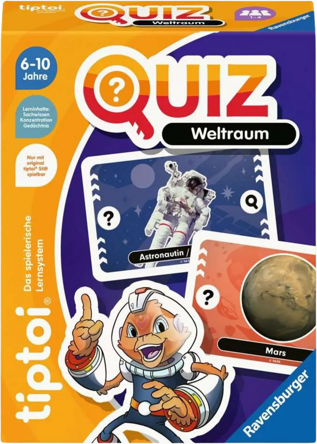 De tiptoi® Quiz Space nodigt kinderen vanaf 6 jaar uit om deel te nemen aan een spannende race op het eiland Quizamui om spelenderwijs kennis op te doen en hun kennis van het heelal te verdiepen.