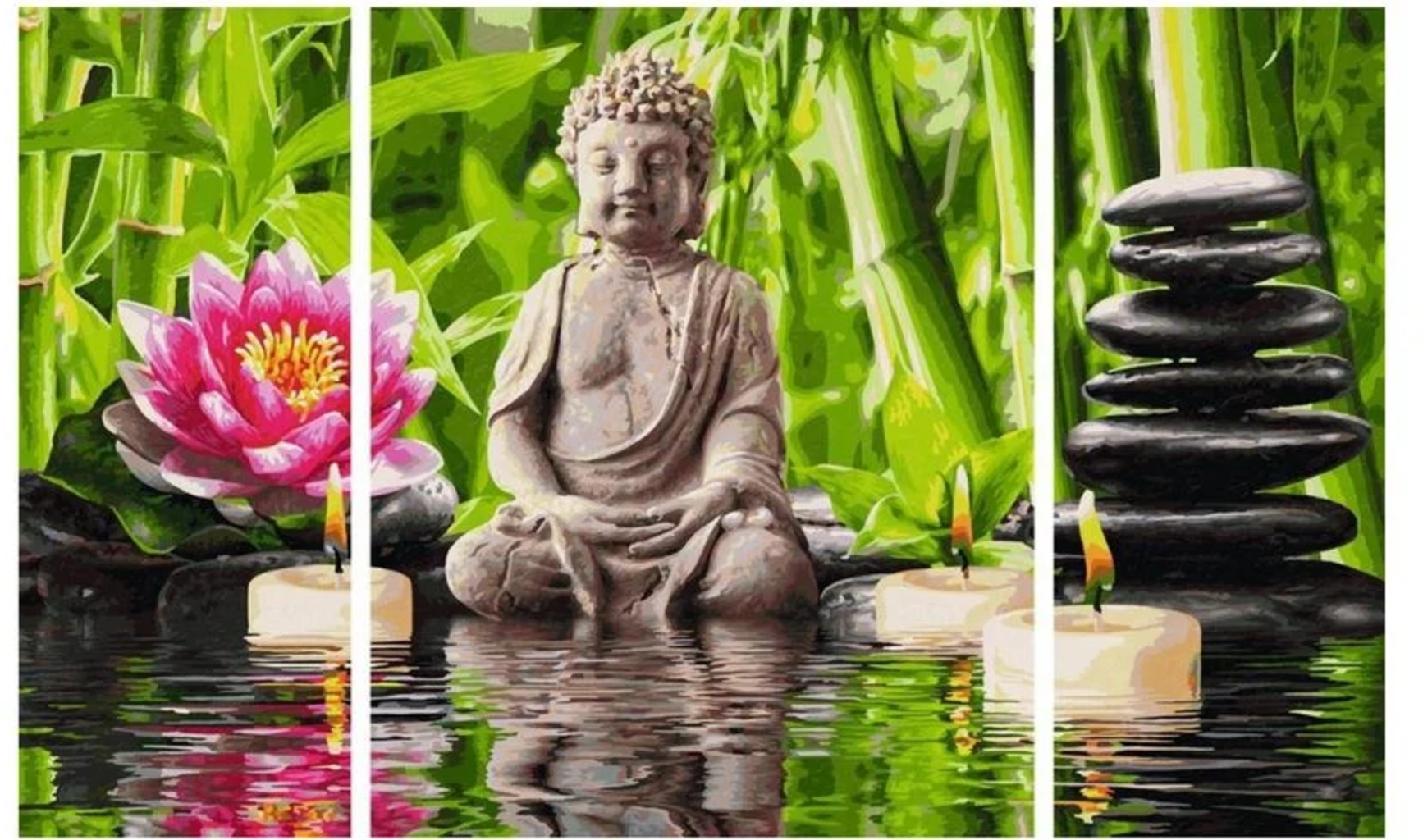 Inhoud: schilderkarton met linnenstructuur (middenpaneel 40 x 50 cm, zijpanelen elk 20 x 50 cm), acrylverf, fijn penseel, controleblad en uitgebreide handleiding in het Duits