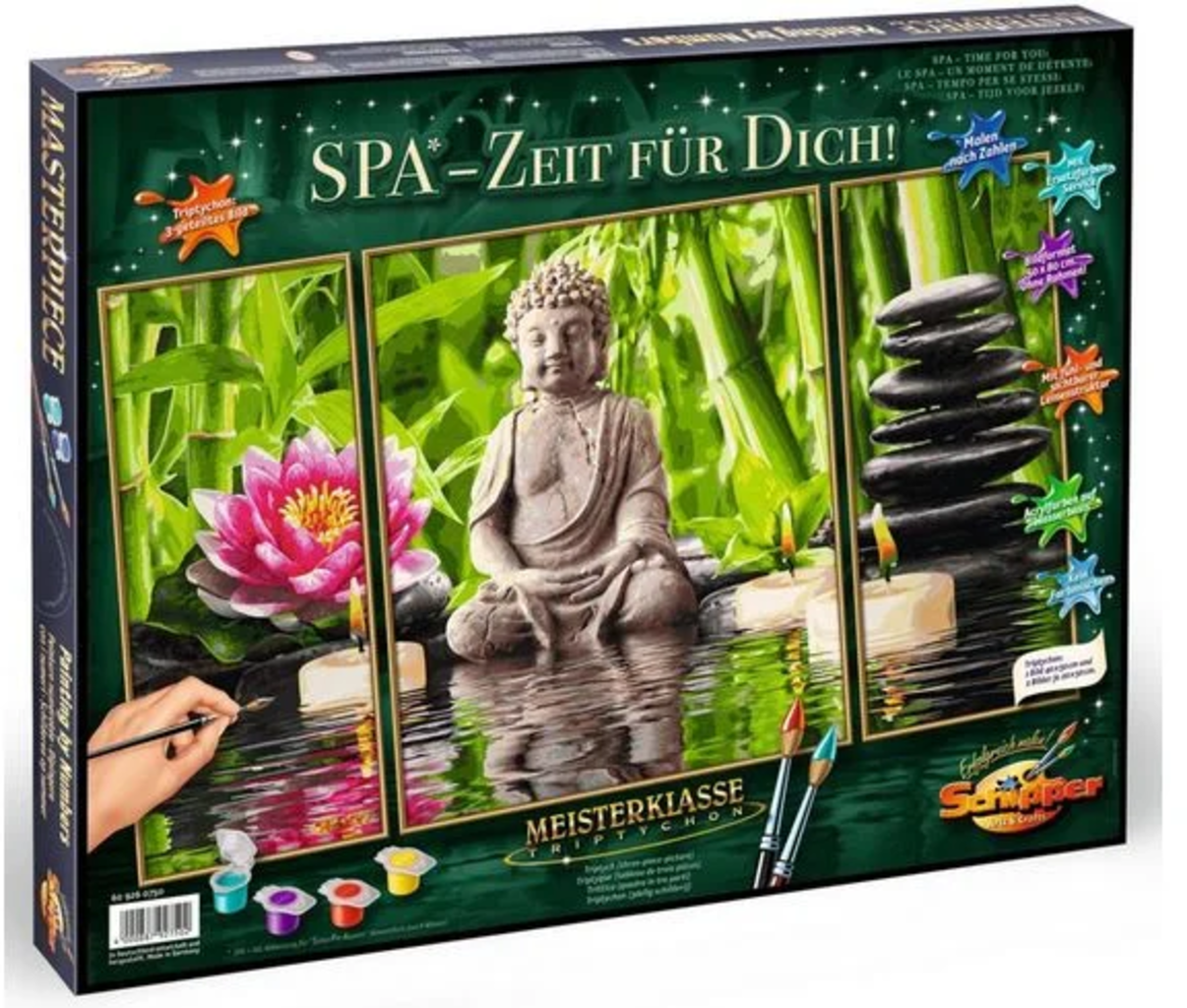 Inhoud: schilderkarton met linnenstructuur (middenpaneel 40 x 50 cm, zijpanelen elk 20 x 50 cm), acrylverf, fijn penseel, controleblad en uitgebreide handleiding in het Duits