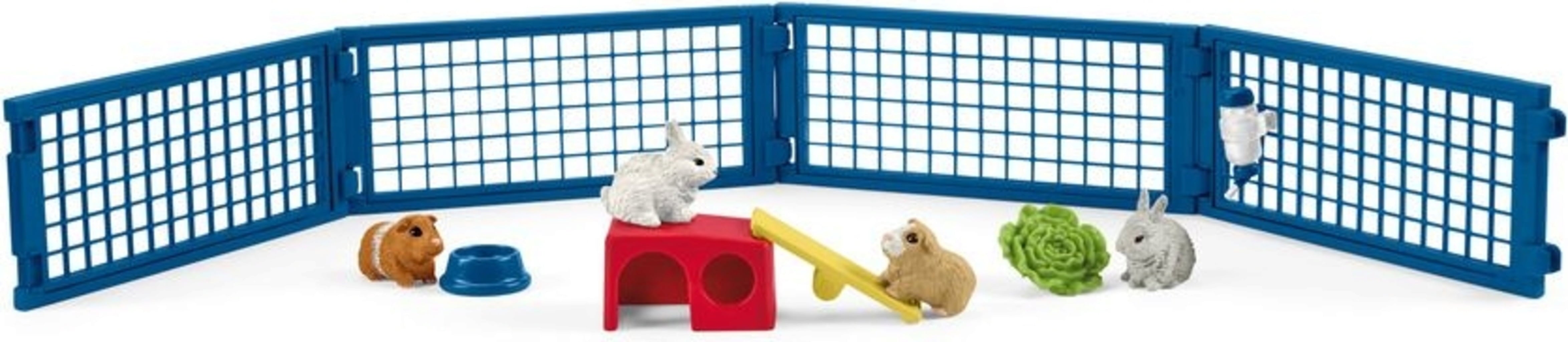 Inhoud: 2x cavia, 2x konijn, 1x huisje, 1x wip, 1x kom, 1x drinkfles, 1x salade, 4x hek