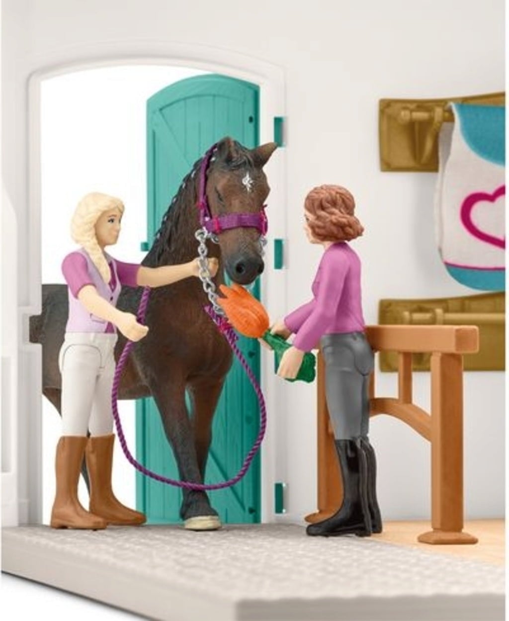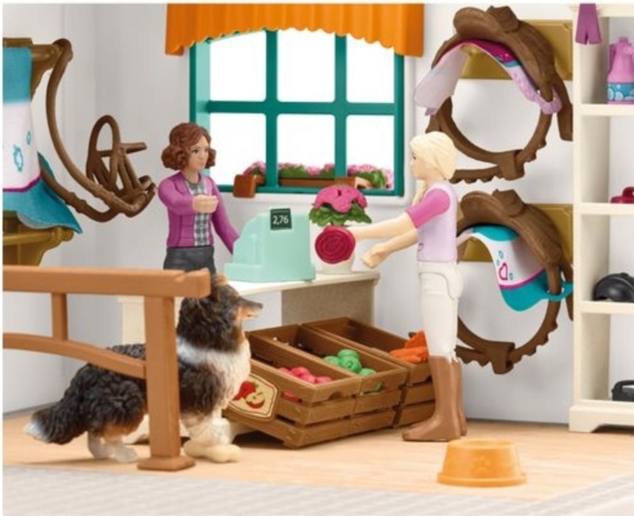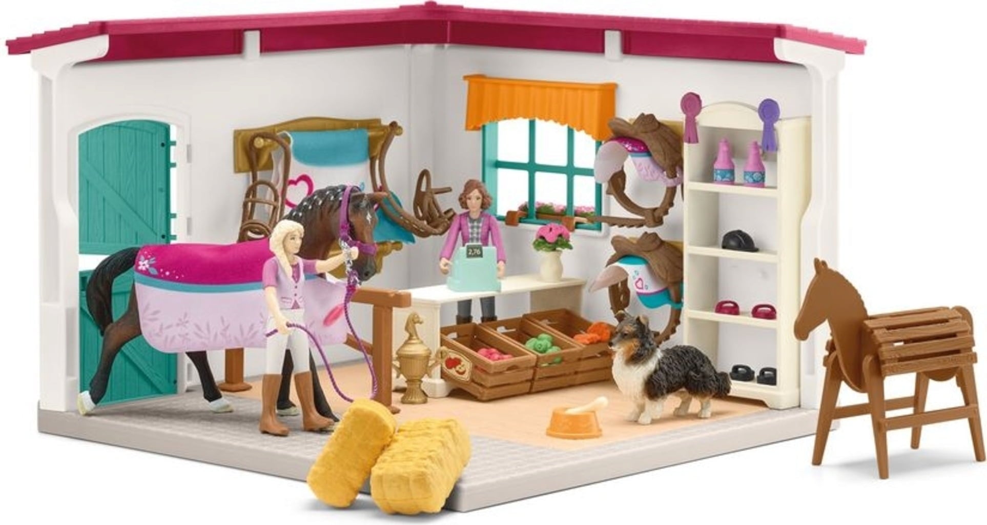 Inhoud: winkelgebouw, 2 wortelen, spuitfles, houten paard, 2 hoofdstellen, 2 zadels, slang, 3 voerbakken, 2 currykammen, 2 borstels, 2 appels, 2 winnaarslinten, trofee, baal stro, vaas, cap, kassa, voerbak, hondenbot, 2 paardendekens, 2 zadeldekens, halster, 2 volledig beweegbare figuren, paard, hond, verkoopbalie