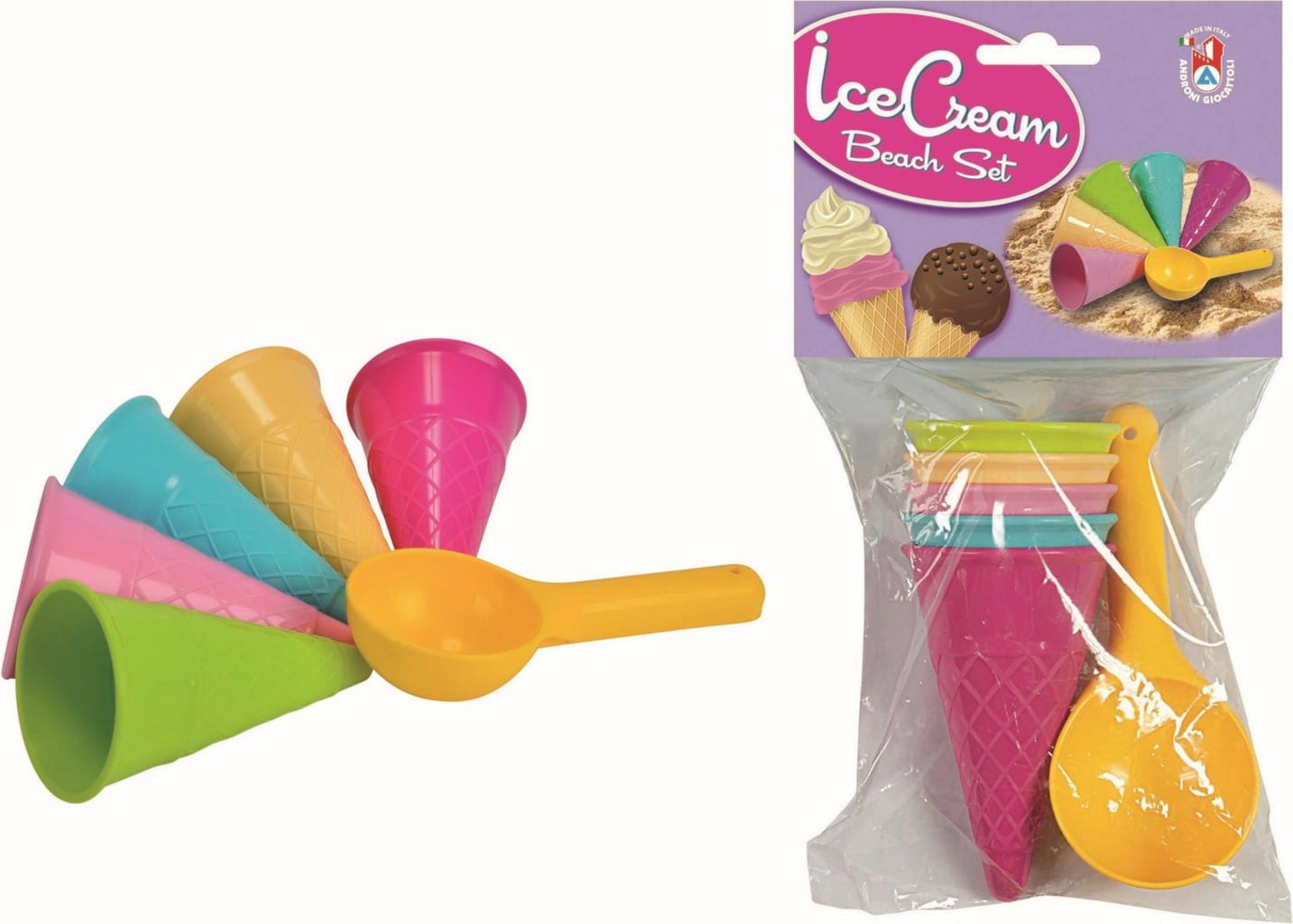 Deze geweldige zandvormpjes laten je niet vervelen in de zandbak! Met de meegeleverde ijslepel is het kinderspel om fantasierijke ijscreaties van zand te maken, die vervolgens speels geserveerd kunnen worden in de vijf kleurrijke ijshoorntjes.