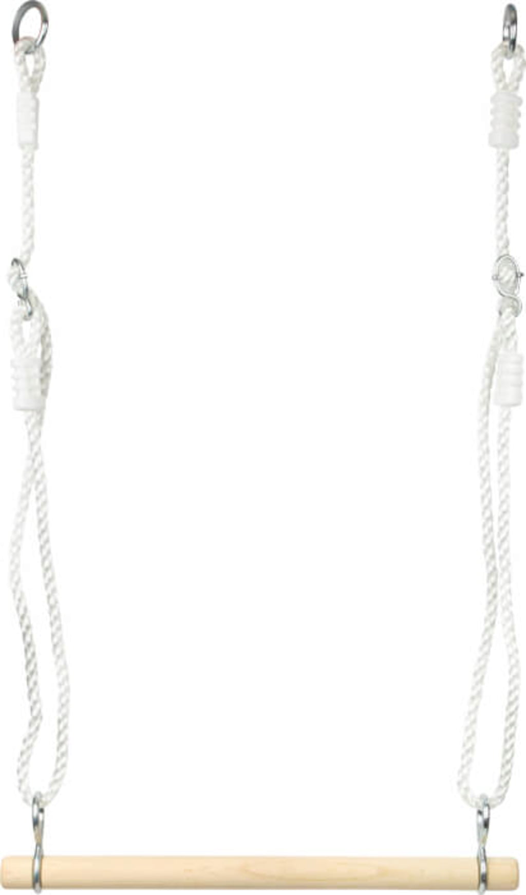 Het is net alsof je in het circus bent! Je kunt normaal zittend op de houten trapeze schommelen, maar als je dapper genoeg bent, kun je ook hangend of zelfs ondersteboven heen en weer slingeren.