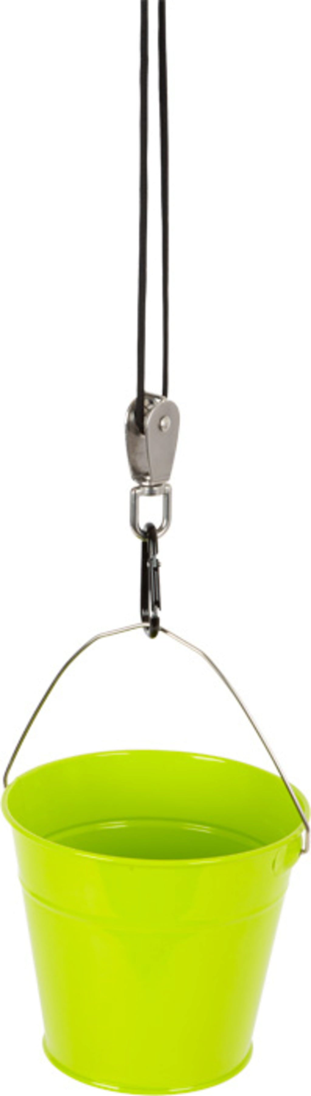 Of het nu gaat om boomhutten, speelhuisjes of klimrekken - met deze ingenieuze katrol kunnen lasten bijna moeiteloos worden getransporteerd. Kleine ontdekkingsreizigers krijgen niet alleen een praktisch hulpje voor hun avonturen, maar leren ook spelenderwijs hoe krachten werken. Om te voorkomen dat de kostbare lading omvalt, houdt een kleine inkeping op het handvat van de emmer de karabijnhaak op zijn plaats.