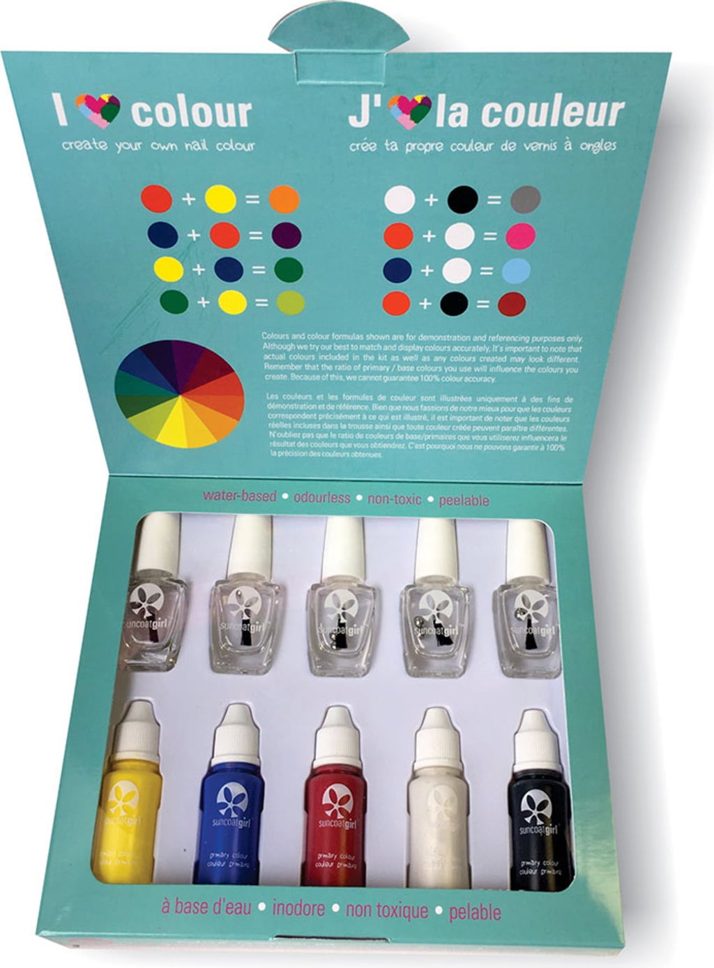 Met deze innovatieve nagellakset kun je je eigen, unieke tinten creëren. Eenvoudig en veilig in gebruik. Giet gewoon de primaire tinten in een van de lege flessen en meng.