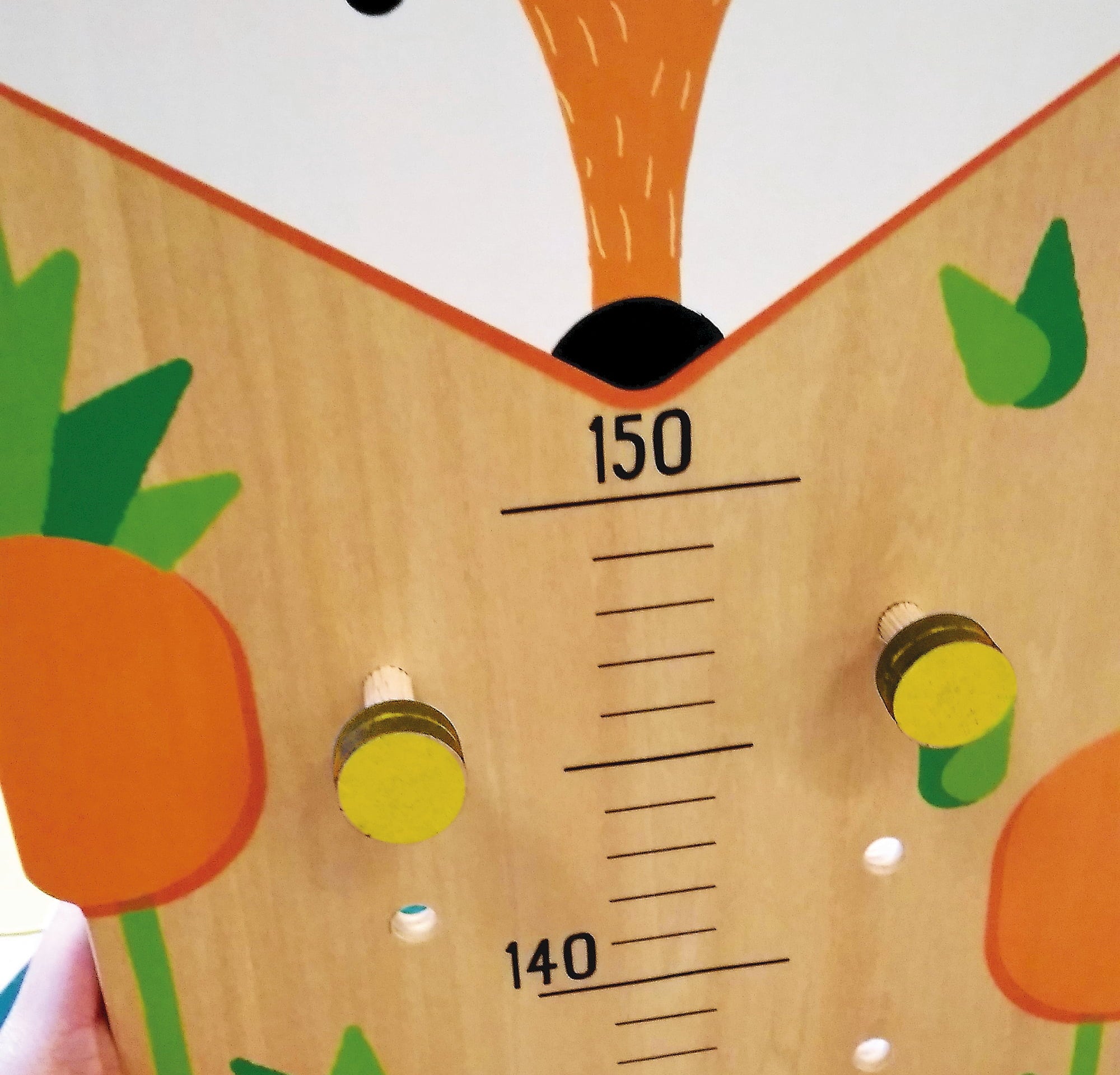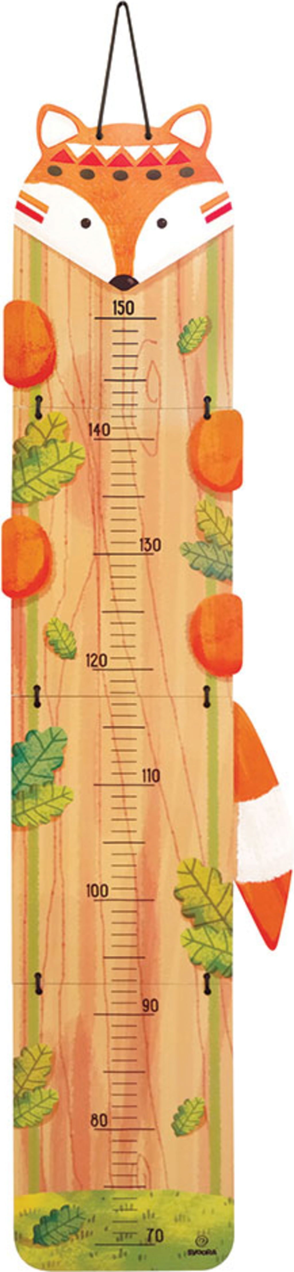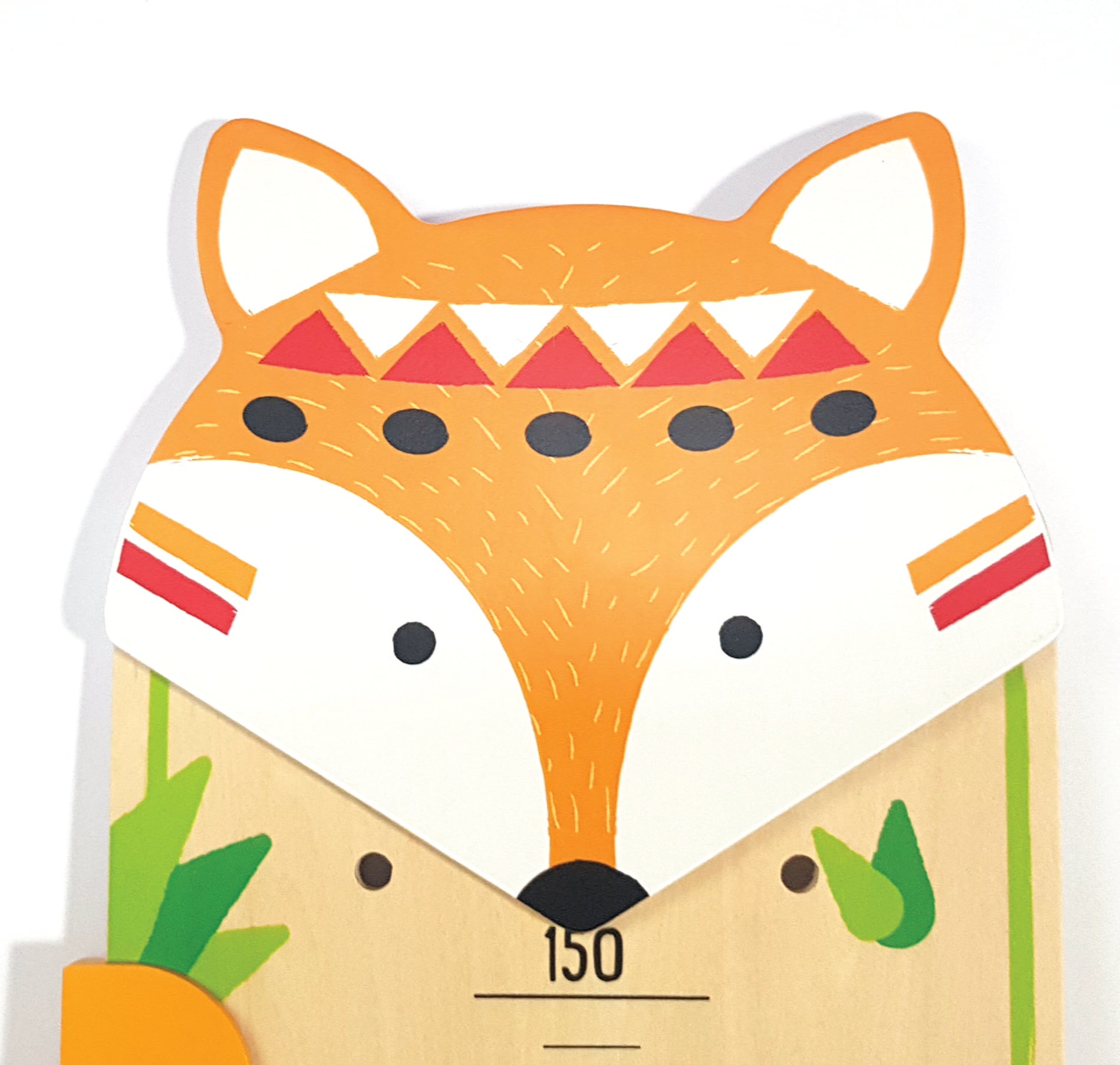 De sluwe vos weet altijd hoe lang je bent. Hij omarmt deze meetlat met een natuurlijke houtlook en kijkt nieuwsgierig op je neer. Je lengte wordt gemarkeerd met houten pijlen die eenvoudig aan de voorbereide openingen worden bevestigd. Door de pijlen te draaien kun je je lengte tot op de millimeter nauwkeurig aangeven. Inclusief vier platen, touwtjes om te verbinden/ophangen en zeven markers.
