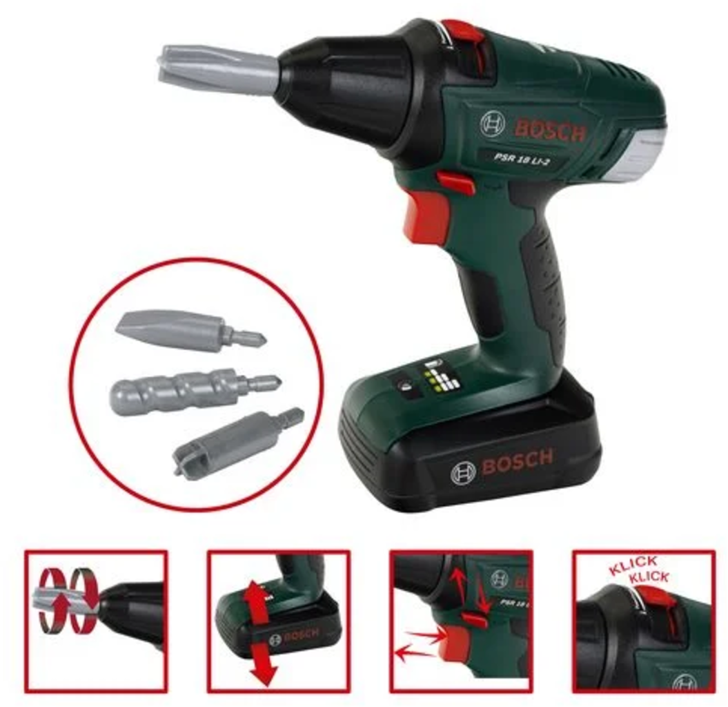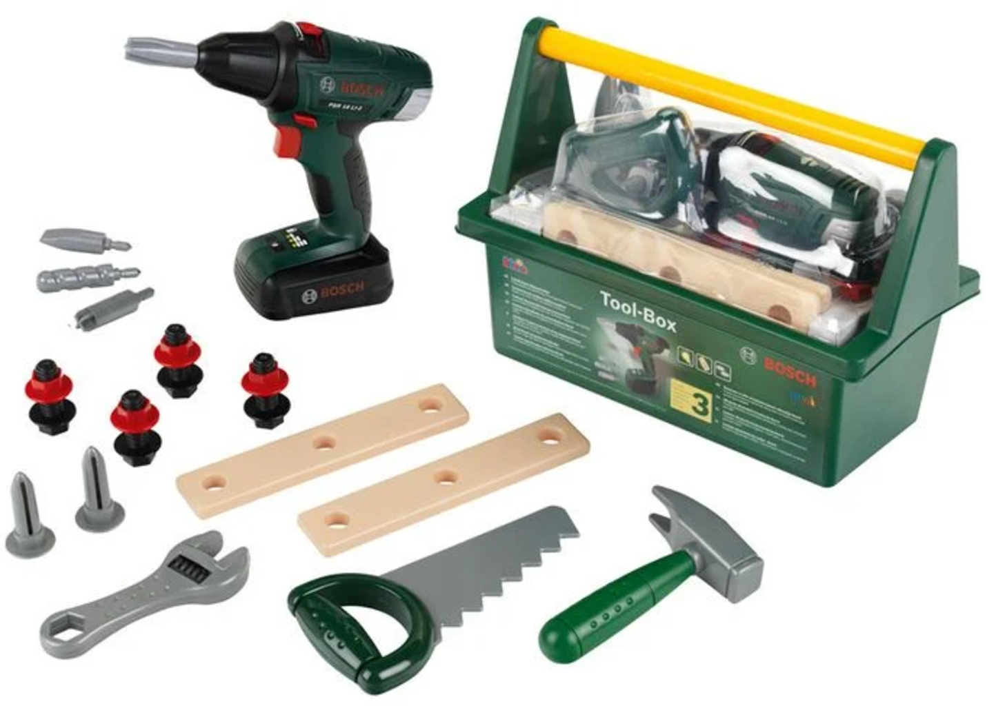Inhoud: hamer, zaag, verstelbare moersleutel, speelgoed spijkers en latjes, schroeven en moeren, Bosch accuschroevendraaier op batterijen met roterende, verwisselbare opzetstukken en een links- en rechtsloop-functie.