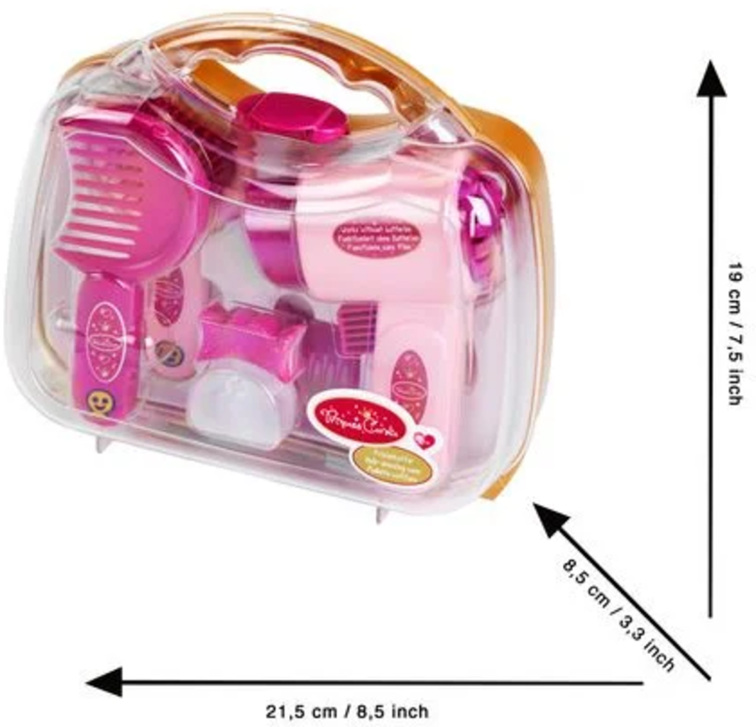 Je haar zit altijd goed in model met deze set. Veel accessoires zoals een kam, borstel, spiegel en haaraccessoires zorgen ervoor dat je altijd nieuwe kapsels kunt creëren. Een speciaal hoogtepunt is de speelgoed haardroger, die zorgt voor een realistische speelervaring zonder elektriciteit.