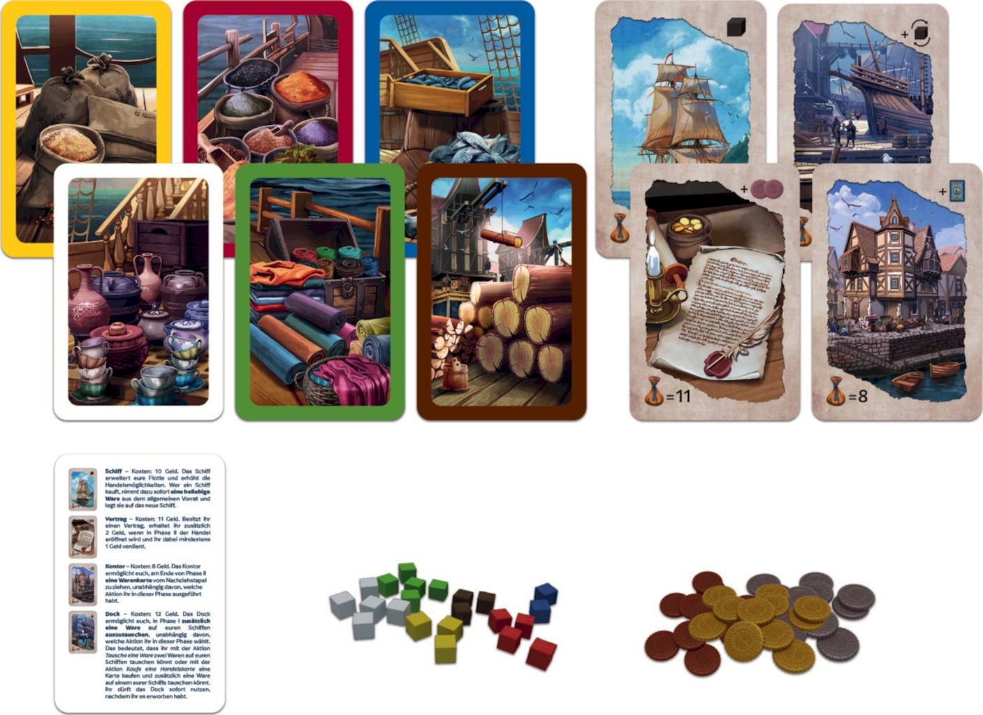 Inhoud: 60 warenkaarten, 20 handelskaarten, 4 hulpkaarten, 30 warenfiches, 55 munten