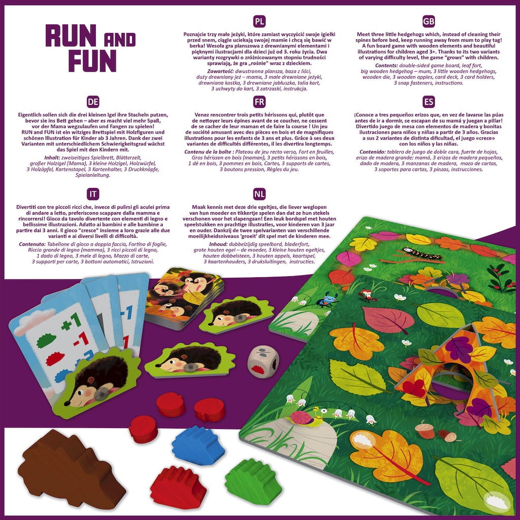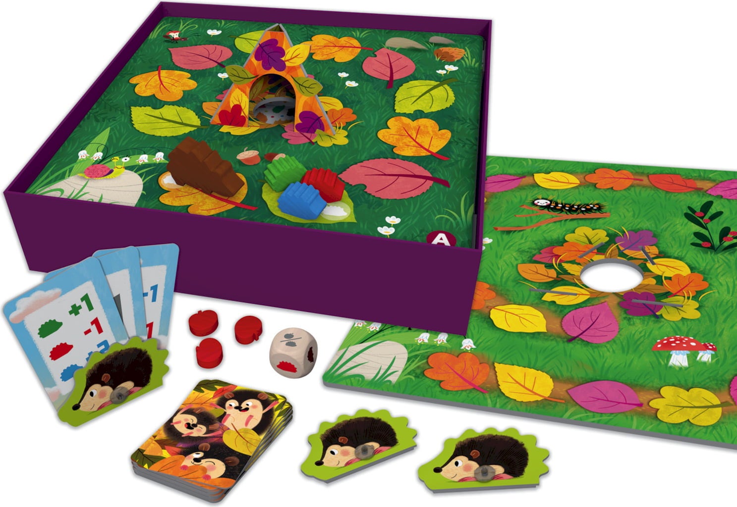 Drie kleine egels willen niet slapen en spelen liever vangbal met mama. Wie is de snelste? Met behulp van gekleurde dobbelstenen en kaarten racen de egelkinderen tegen elkaar.